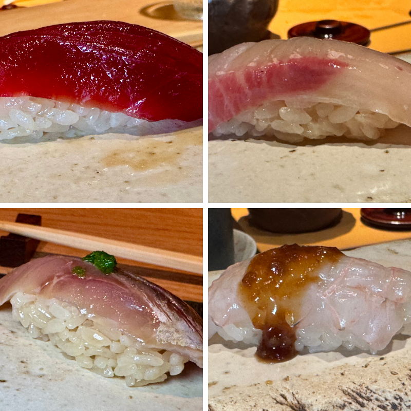 1.- Nigiri de Akami. 2.- Hamachi. 3.- Jurel. 4.- Cigala
