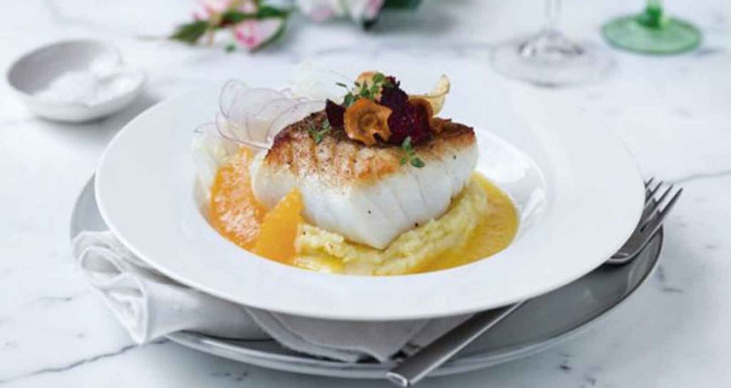 Leer másSkrei a la sartén con salsa de naranja y puré de patata