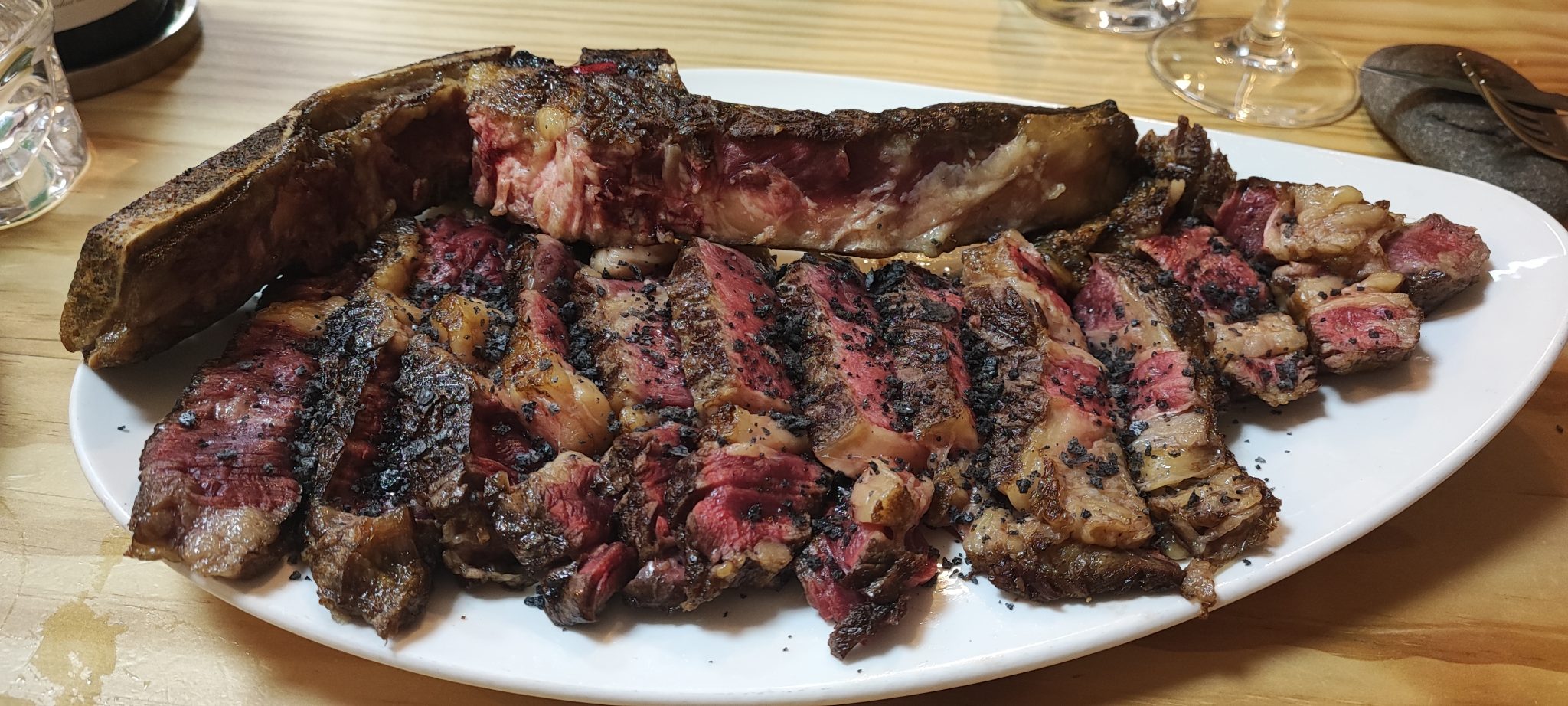 Las especialidades del negocio tienen mucho que ver con la inversión realizada en 2024 en una parrilla y horno de carbón donde se posan pescados salvajes “de lonja” y chuletas de buey gallego y de vacas simmenthal y holstein.