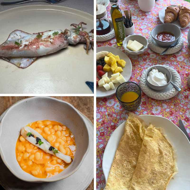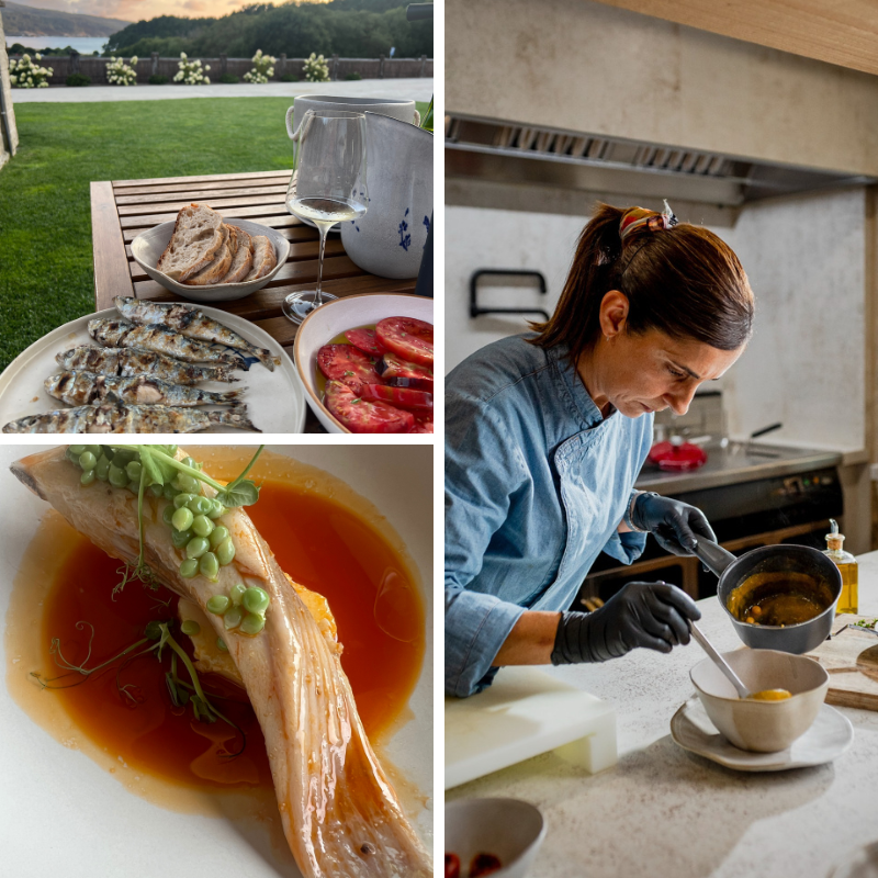 Pero queriéndolo o no, el paisaje se cuela por las rendijas y entra en las cálidas habitaciones, pero también en la cocina. Los platos de Silvia huelen y saben a Galicia. A esa Galicia agreste y brava donde los musgos se mezclan con las algas, la niebla con el rocío y cuyos bosques nos transportan a Los Pazos de Ulloa, Los gozos y las sombras, En las orillas del Sil o La lengua de las mariposas, ese imaginario gallego presente en la literatura, el cine y la vida. Piezas desnudas como el chipirón salteado o arropadas como la raya en caldeirada, esa salsa esencial tan mágica como el entorno.