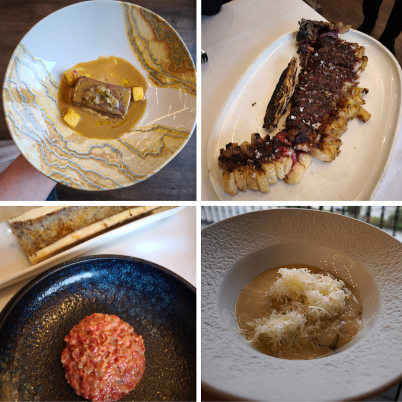1.- Pastrami tibio de buey, polenta casera, salsa café de París y encurtidos. 2.- Chuleta asada. 3.- Steak tartar y tuétano de buey. 4.- Carbonara de buey, crujiente de zancarrón y queso de Karrantza.