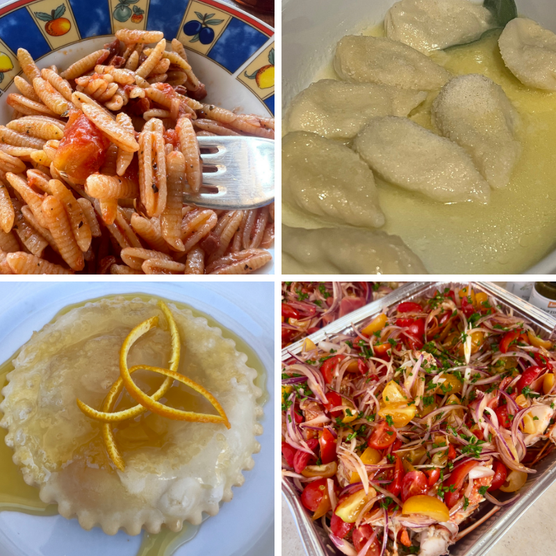 Cerdeña tiene una cocina de montaña y mar, sencilla y sabrosa. Algunas de las especialidades más famosas son el pane carasau: pan fino y crujiente, horneado dos veces. A veces servido con aceite y romero ( en ese caso se llama guttiau). Los culurgiones: raviolis rellenos de patata, menta y pecorino, y los malloreddus: ñoquis sardos, tradicionalmente servidos con salsa de salchicha y azafrán. O la increíble langosta a la catalana -vestigio de cuando aquí reinó la corona de Aragón- que se prepara con cebolla morada y tomate como si fuera un salpicón, el interior de sus cabezas batido con aceite virgen extra, también sardo.