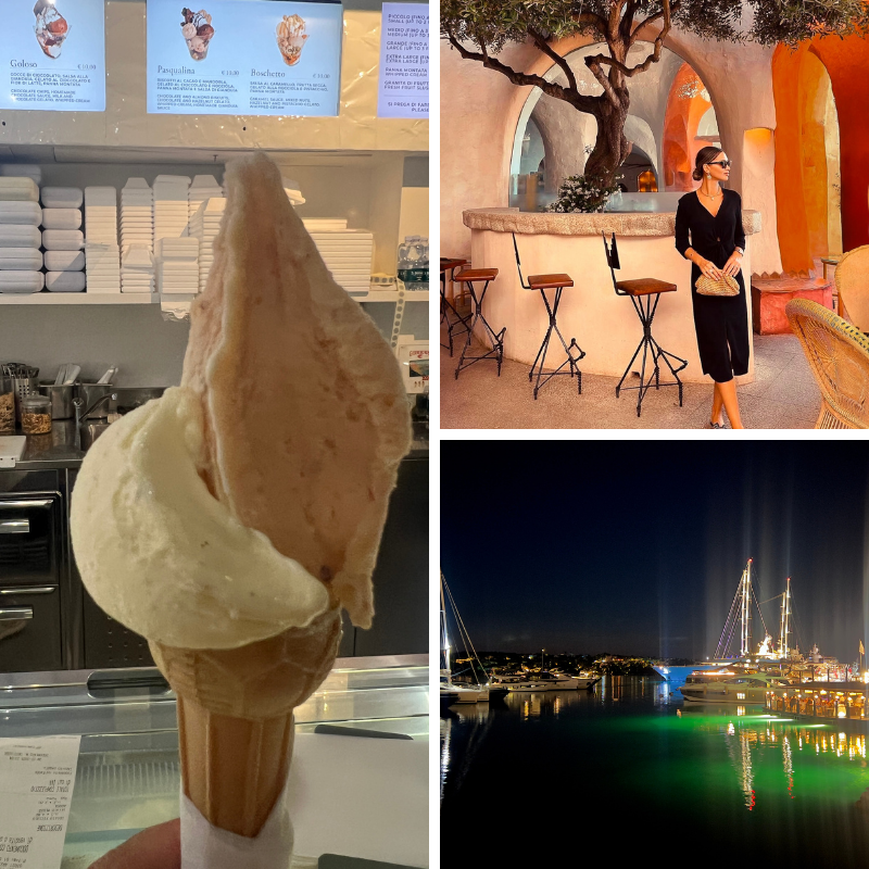 Una buena idea para cenar es reservar mesa en la pizzeria Da michelle que tiene aquí una sucursal o en Crazy Pizza una de las más concurridas del puerto. Después de dar una vuelta por la piazzetta donde se concentran todas las firmas de moda de lujo, se impone tomar un helado en heladería La Pascualina. El de melocotón es un espectáculo, pero el de regaliz también merece la pena. Y por supuesto los clásicos de limón, vainilla, chocolate, etc. La Pascualina es una institución. Desde 1912 llevan preparando helados, pasteles. pastas y bombones. Pero dos pastelerías más le van a la zaga: Cigno Bianco en el Golfo de Aranci: sua especialidades il Cestino zabaglione y gianduia (un cesto de masa de almendra como un encaje, relleno de semifreddo) y la torta de limone. Siempre por encargo. La otra es Sa Conca, también en Porto Cervo, donde tiene fama el bignet mignon. También puedes volver de día por esta zona y visitar playas como Liscia Ruja y Petra Bianca, donde el granito rosa, el agua turquesa y la vegetación mediterránea componen un paisaje inolvidable.