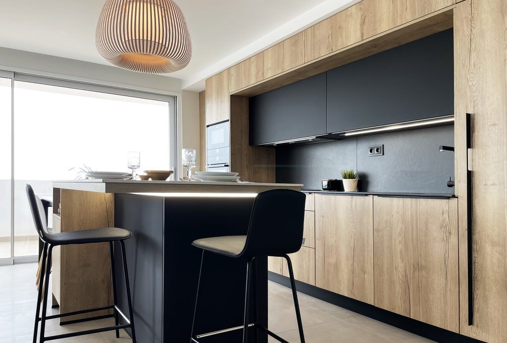 En las islas, el diseño se adapta al clima y a la conexión con el exterior. Tonos marinos o volcánicos, materiales resistentes y distribuciones abiertas que rompen entre el interior y el exterior. En muchas viviendas, las cocina al aire libre son una extensión del hogar. Soluciones como vinotecas, grifos escamoteables o enchufes integrados se combinan apostando por la sostenibilidad. Espacios que se usan para cocinar, pero también para disfrutar del entorno y la estética.
