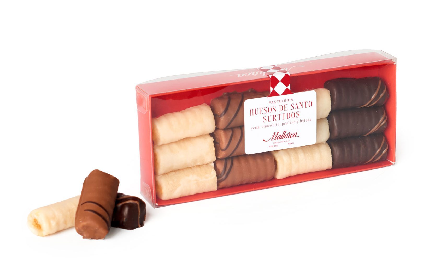 Su origen se remonta al siglo XVII. Comenzaron a elaborarse en conventos y obradores artesanos coincidiendo con el 1 de noviembre. Aunque su apariencia pueda parecer sencilla, su preparación requiere paciencia y técnica: un pequeño cilindro de mazapán que envuelve un relleno de crema de yema, en su versión más clásica. En la icónica Pastelería Mallorca, elaboran a mano cada pieza, siguiendo la receta de siempre, aunque ofrecen también una selección especial de trufa y praliné y cubiertos de chocolate con leche y negro.