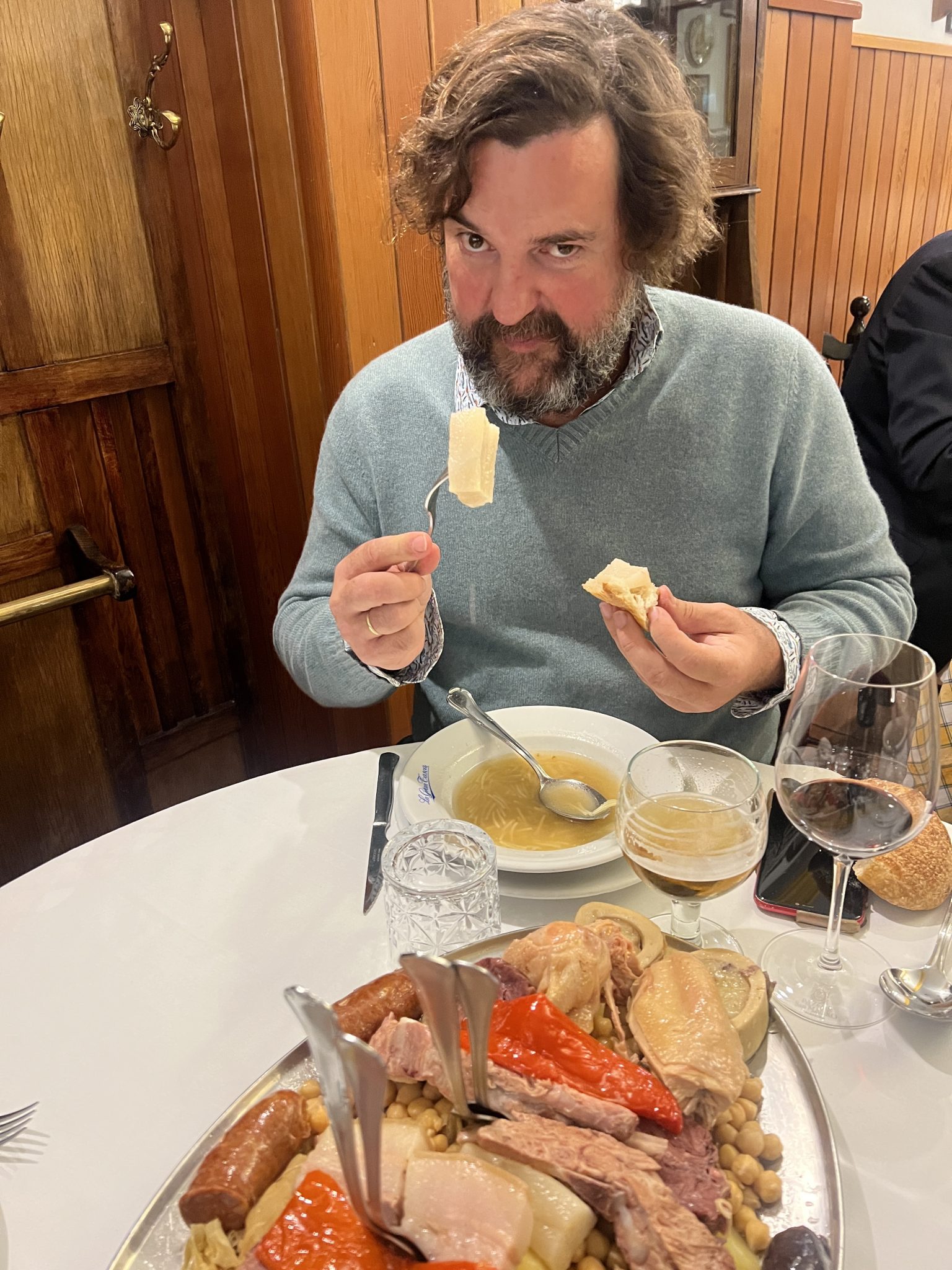 Quedo con él en La Gran Tasca de Madrid, ciudad en la que vive, para dar buena cuenta de un cocido en tres vuelcos mientras charlamos. Disfruto viéndole disfrutar. «Esto es lo que más me gusta. Mojar pan con el tocino, comer con las manos. De niños, en casa, no nos dejaban. No nos ponían libros en la cabeza para que estuviéramos derechos, pero en la mesa había que comportarse».