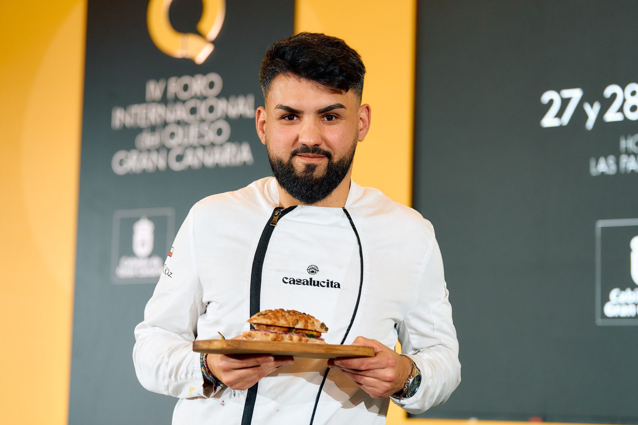 Kevin Díaz Perdomo, cocinero majorero afincado en Cantabria, donde trabaja en el restaurante Casa Lucita, ha ganado el III Concurso de Bocadillos con Queso, celebrado durante la primera jornada del IV Foro Internacional del Queso de Gran Canaria, con un bocadillo, elaboradao con queso de Guía Media Flor, bautizado como “Pizco”. Incluía embutido de solomillo de cordero preparado por el propio cocinero, una crema de queso con vino tinto y mermelada de pimiento del piquillo. Todo ello dentro de un pan de masa madre que incorporaba, además, queso y nueces.