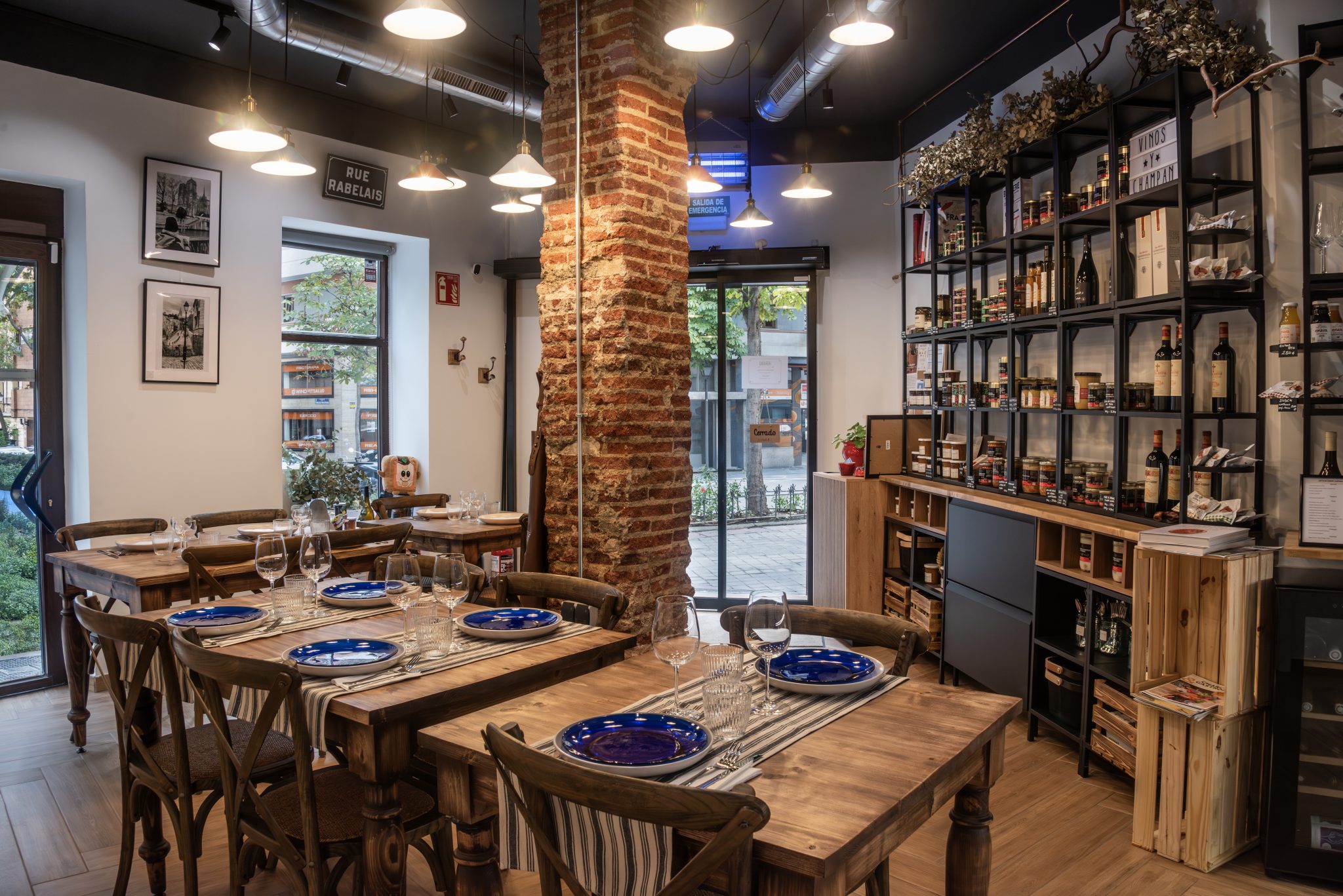 El espacio actúa también como una boutique gourmet con productos seleccionados tanto de Francia como de España: embutidos de Salamanca, mermeladas artesanas La Trinquelinette, legumbres y patés de La Maison Gratien, mostazas Maison Dupont, y una selección de vinos y champagnes, entre los que destaca el vino Almodóvar, de la bodega manchega Más Que Vinos.