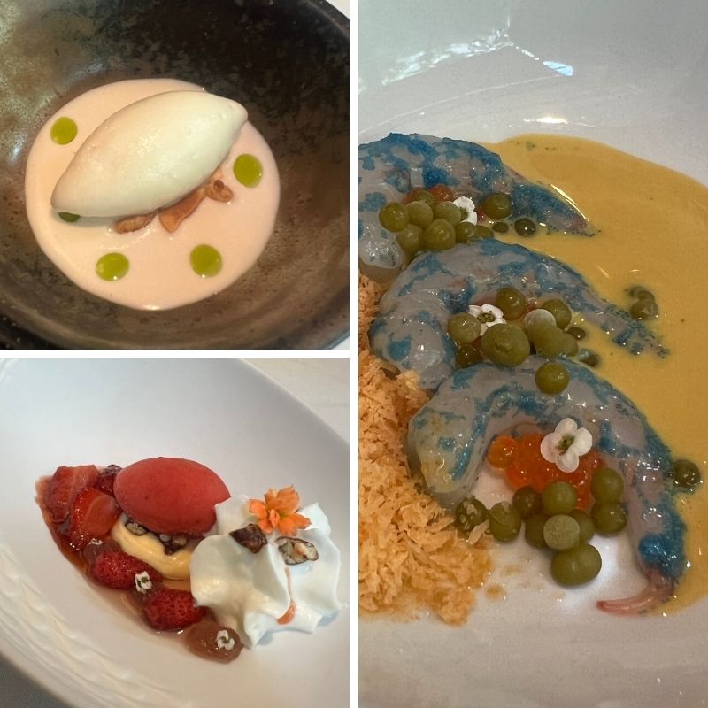 1.- Helado de almendra tierna con vinagre de piñón 2.- Quisquillas cocinadas como cangrejos de río 3.- Fresitas de Aranjuez