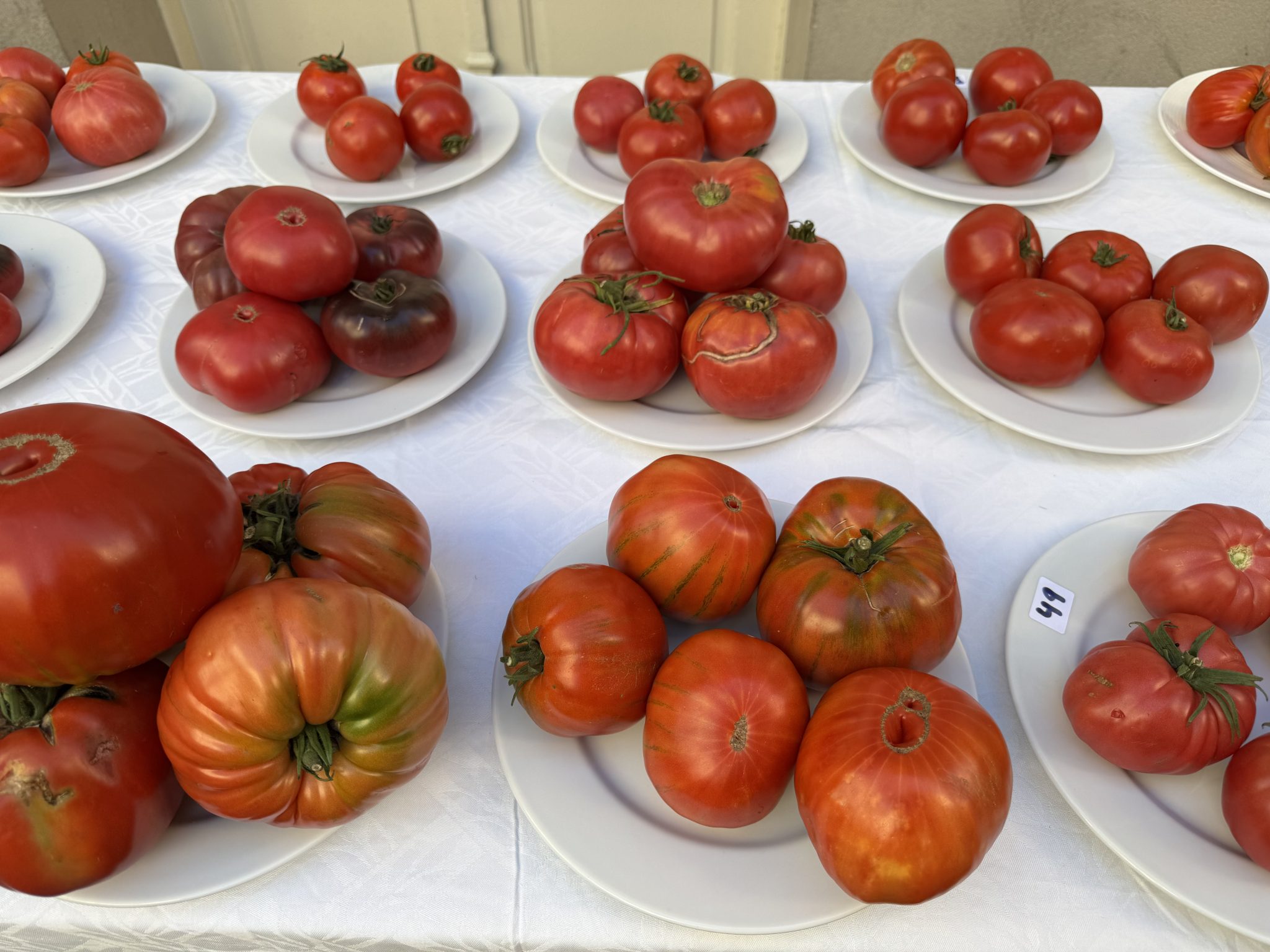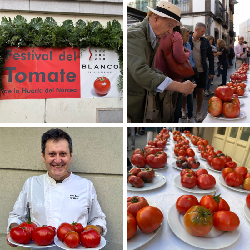 Fechas propicias para estas solanáceas que alcanzan su punto óptimo de maduración entre finales de agosto y mediados de septiembre. Tomates de naturaleza efímera, muy perecederos, sin ninguna relación con los de producción intensiva y larga duración que inundan las grandes superficies durante todo el año. Piezas que se presentaban sin haber pasado por cámaras de refrigeración, método de conservación que malogra sus características. ¿Cuántos de aquellos tomates expuestos procedían de semillas antiguas no modificadas genéticamente? Algo que no sabíamos, aunque presagiábamos un número escaso.