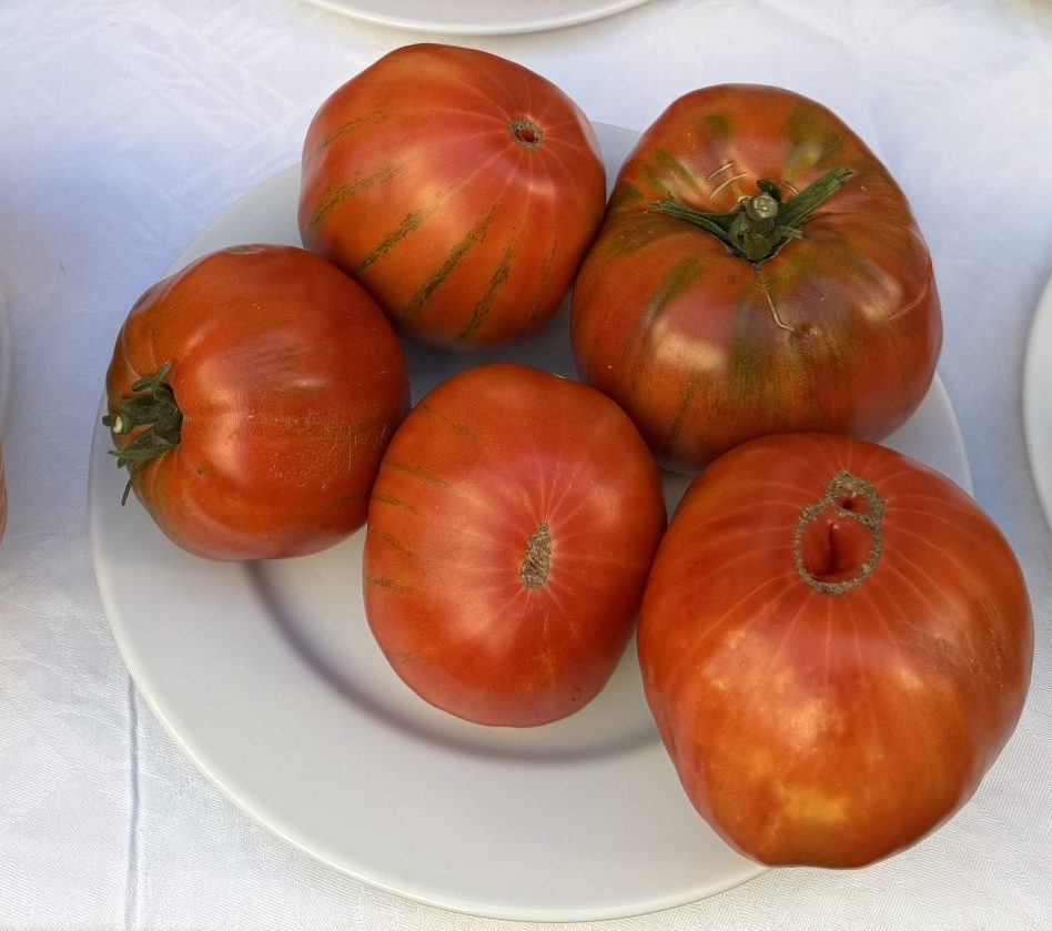 Conjunto de colorido restallante y formas irregulares: de tamaño medio, pequeño o grande; desmesurados; de hombros estriados o de perfiles redondeados; con tonalidades rosáceas o carmesí oscuro virando a verdes aceitunados. Nada de esos tomates clónicos a los que nos tienen acostumbrados las grandes superficies, aunque alguno se asemejase al modelo estándar.