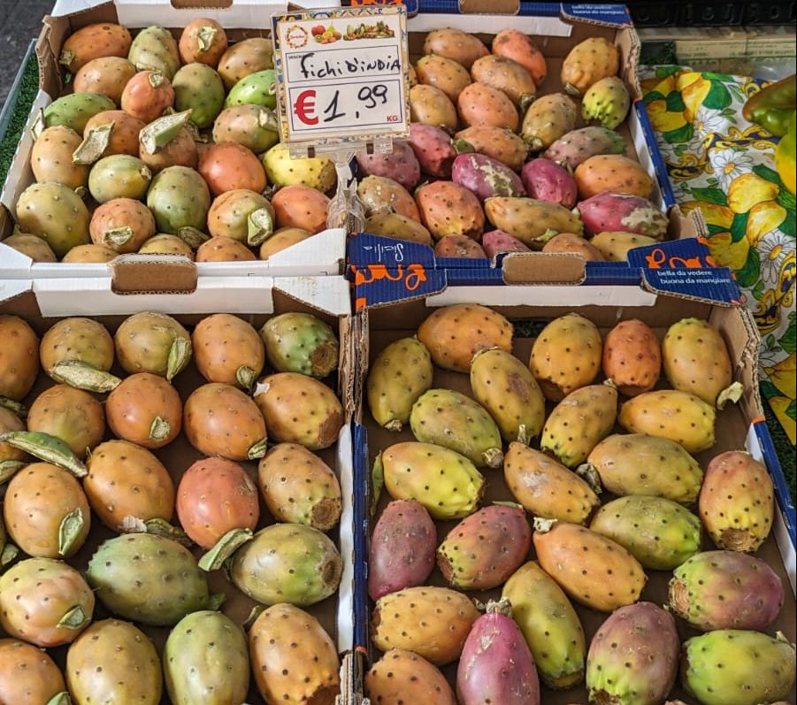 Rosas, anaranjados, granates, verdes pálidos o amarillos: los higos chumbos pintan el paisaje de la isla y constituyen un símbolo de su cultura. En las fruterías, los vendedores los ofrecen ya limpios, mostrando una piel libre de espinas como garantía de cuidado y del minucioso trabajo de recolección. Su sabor es sencillo, primando el dulzor sobre los matices aromáticos. Lo más habitual es tomarlos en licuados para evitar sus numerosas pepitas. La variedad más apreciada es la cultivada en los suelos volcánicos del Etna, con Denominación de Origen Protegida. A finales de septiembre llega una segunda cosecha, de frutos aún más grandes y jugosos: los llamados bastardoni.