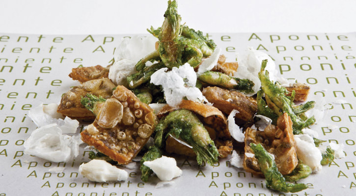El manido «mar y montaña» se transforma en Aponiente (El Puerto de Santa María) en huerto y marisma cuando los guisantes de navazo de Cultivo Desterrado chocan de frente con las quisquillas que nadan en un sutil jugo de pimiento verde con nata agria como contrapunto. Un plato elegante, sabroso, untuoso y ligero al tiempo que llena la boca y te hace recuperar la fe en el guiso y el aderezo.