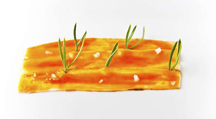 Los postres nunca fueron el fuerte de Ángel León. Como suele decir «Yo pienso salado y cocino salado», sin embargo desde hace dos años David Gil, tal vez el pastelero más creativo de España, le acompaña en su búsqueda del dulzor del mar. Primero la encontró en el calamar y este año la descubre en la piel de la morena tratada como si fuera un mochi ¡Espectacular! No solo es que el postre sea sabroso y apetecible (si no se piensa que es la piel de un pez horrible), es el concepto mismo del plato lo que lo hace tan singular. Bajo la piel se esconde una capa de crema de arroz y se acompaña con un helado.