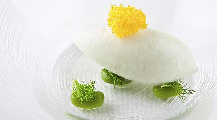 Quienes no disfruten con el pescado tendrán un serio problema. En Aponiente no se sirve otra cosa. La bienvenida en los pabellones de cristal antes de llegar al molino ahora precedido por cuatro olivos regalo de la familia Vañó (Castillo de Canena), es una bocanada de mar: yemas de erizo con leche, flan de huevas de lisa con caramelo de mojama y las tortillitas de camarones, versión crujiente de la filigrana popular, en las que los camarones no se fríen sino que se colocan sobre el encaje tostado.
