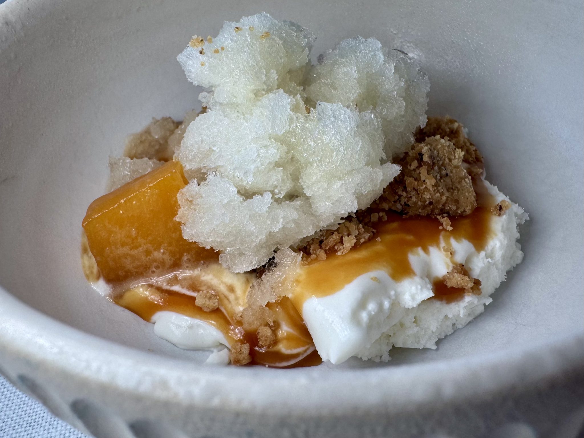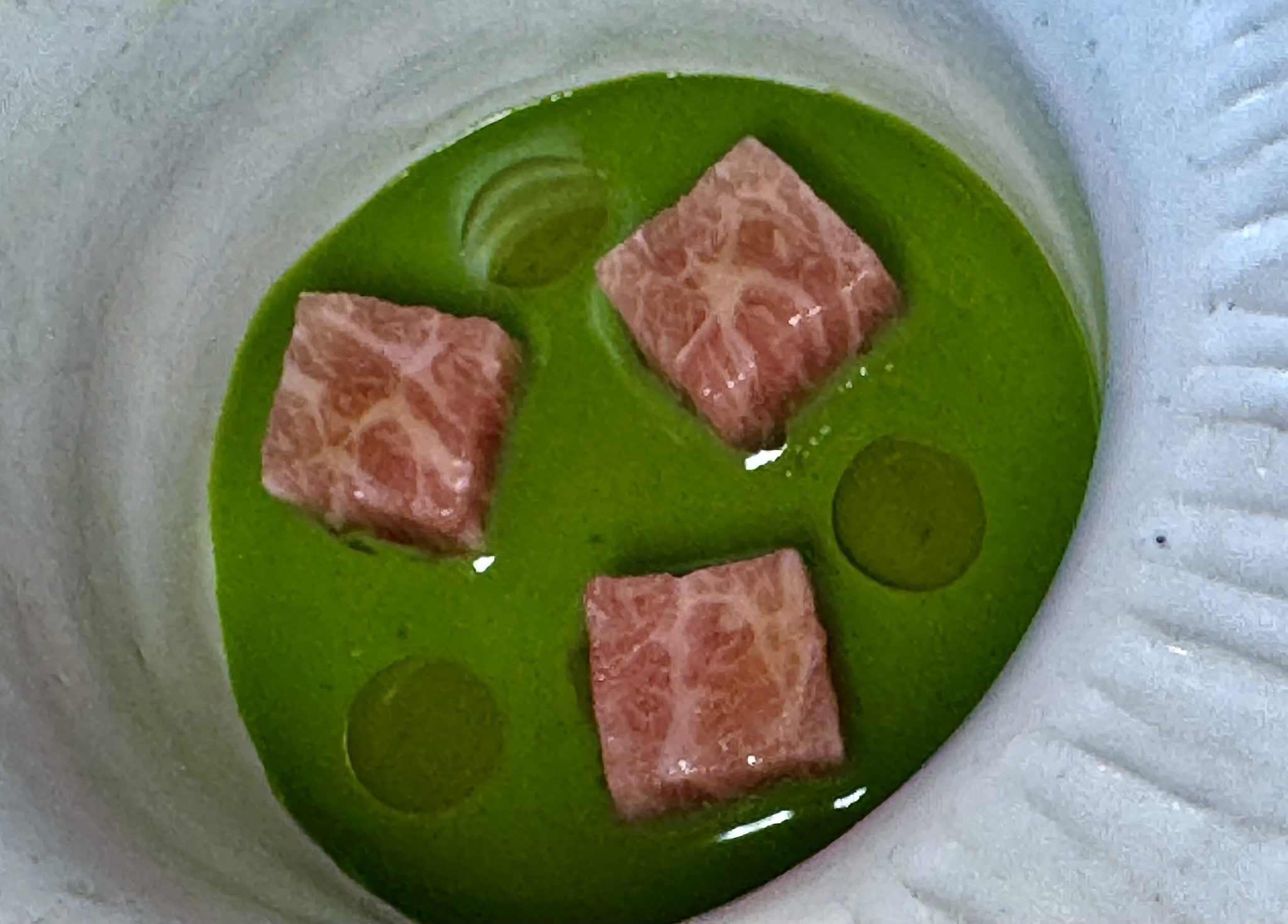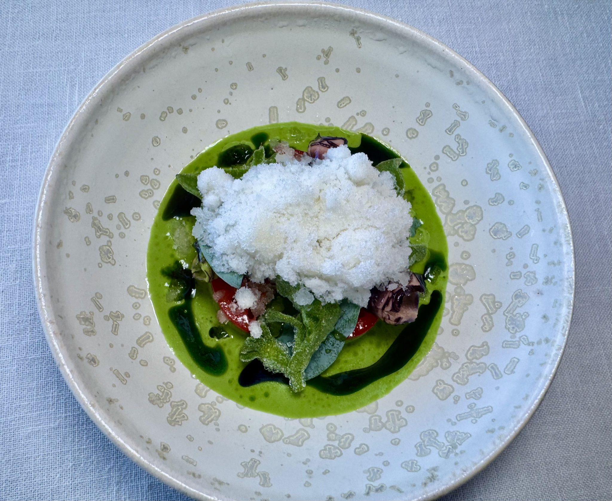 En la antesala de los postres solo un plato deja indiferente, el cordero recental, con pesto de pasto y piel de leche, carente de la chispa que caracteriza a los anteriores.