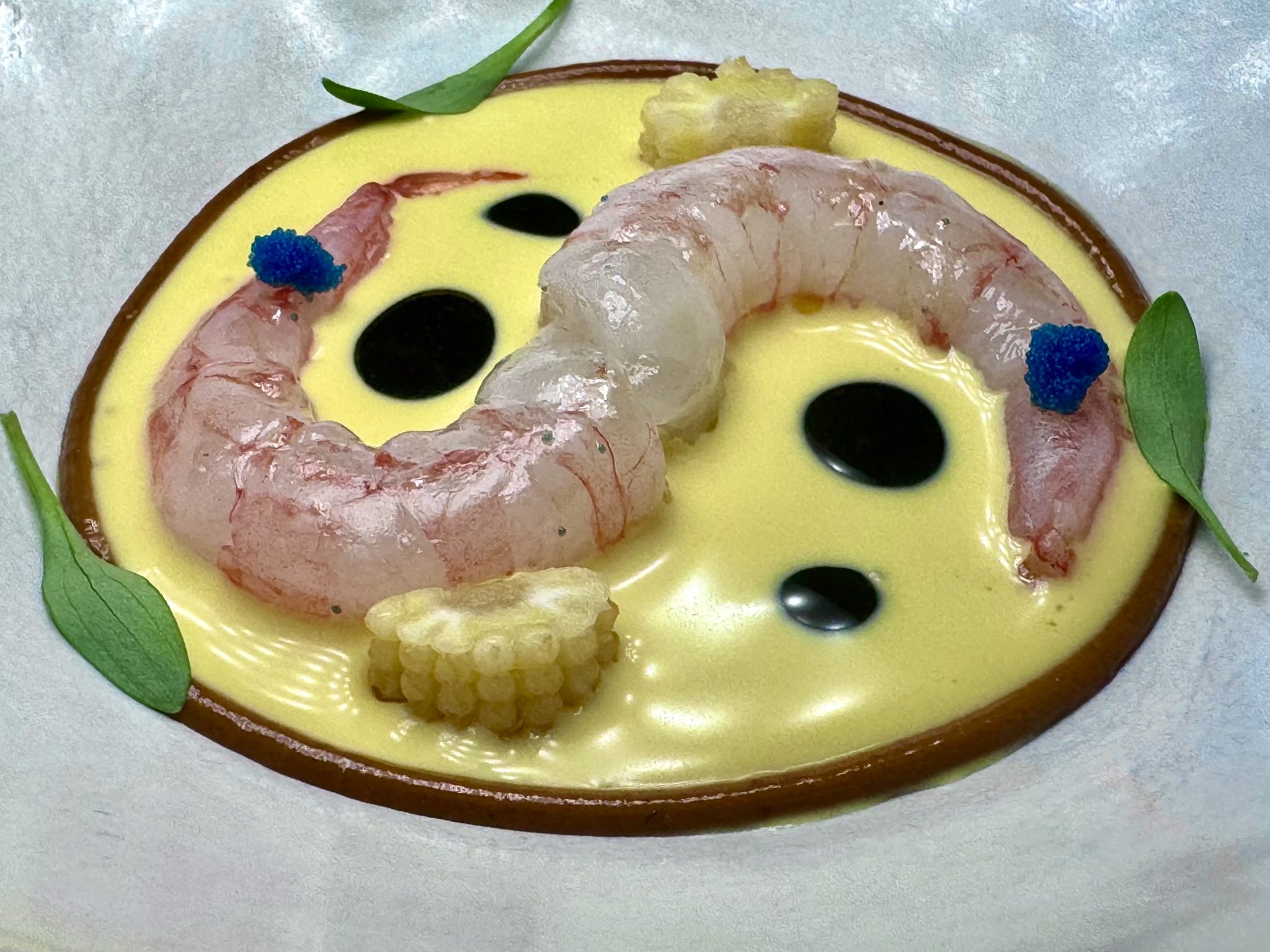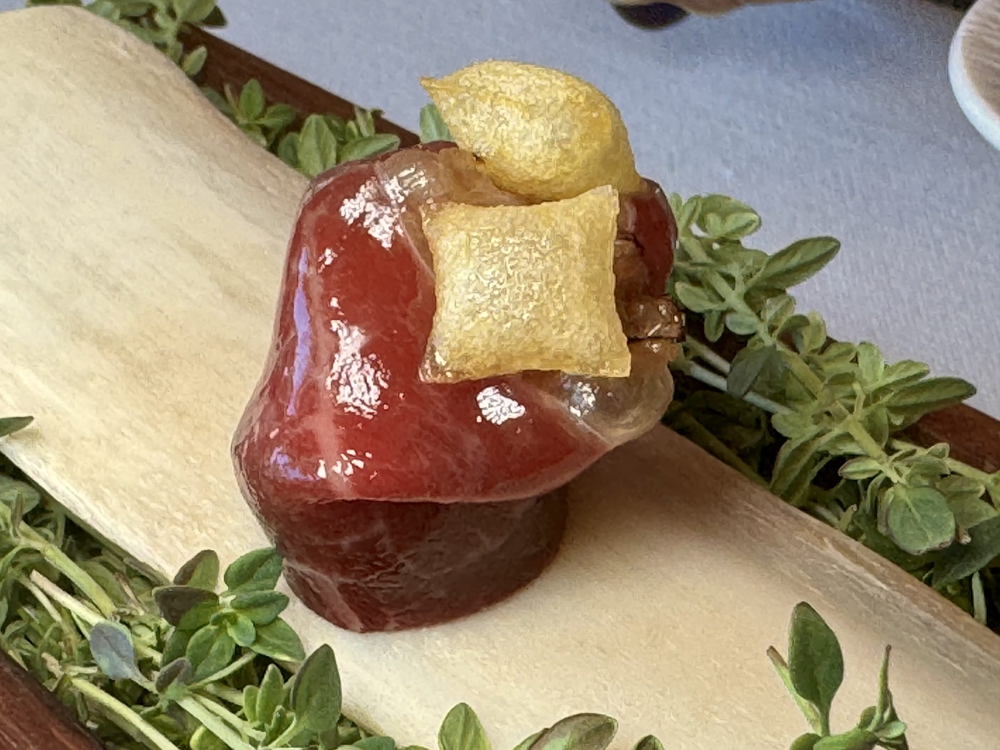 El epicentro del recorrido lo ocupan tres platos que dejan huella. Soberbias las quisquillas con maíz, vainilla y salsa macha: tiernas, dulzonas y suavemente picantes; delicado el mal llamado gazpachuelo de judías verdes, con águila, chantarellas y calabacín, y monumental la cebolla en manteca colorá (ingrediente fetiche de Benito) con consomé ibérico y trufa de verano.