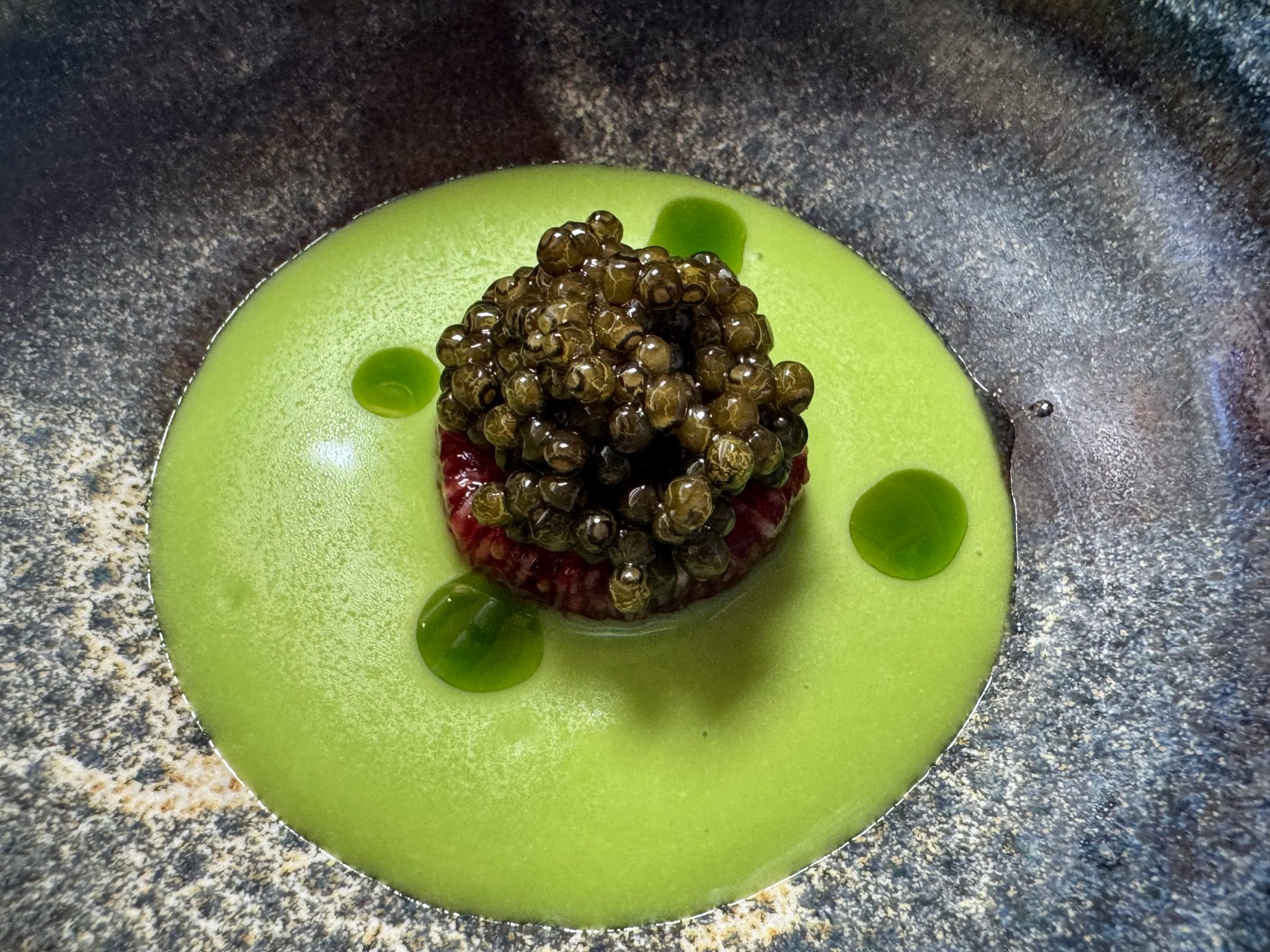 Nada de lo que Gómez realiza alcanzaría la misma envergadura sin la presencia de la joven Nini Rivera, jefa de pastelería y finalista del premio Pastelero Revelación en Madrid Fusión 2024, que dirige la cocina. Ni tampoco sin el oficio de Manuel Romero, profesional de talento, ascendido a chef ejecutivo tras la apertura de los nuevos locales del grupo (Tragatá Málaga y Dalmar en el hotel Fairmont de Sotogrande).