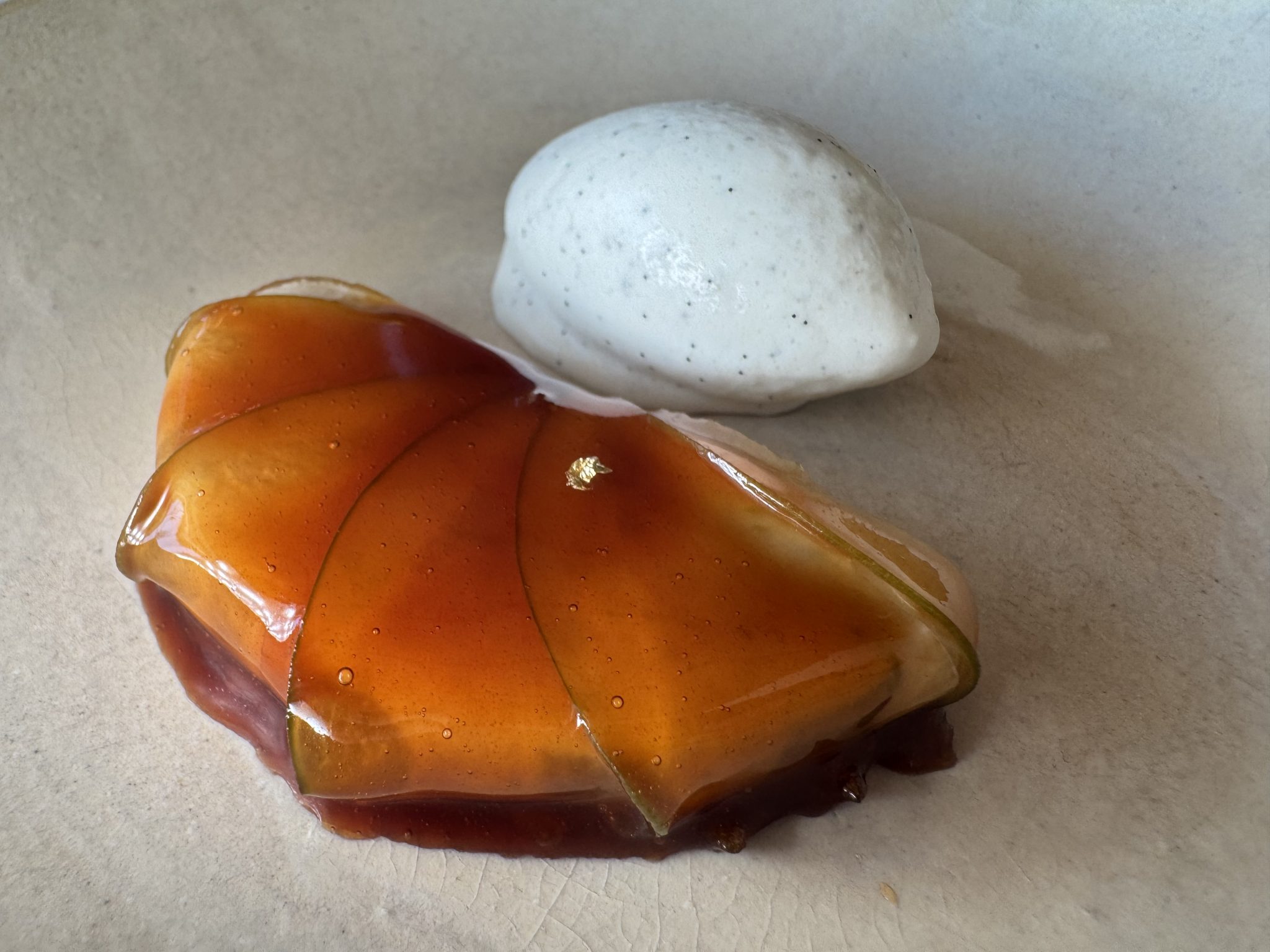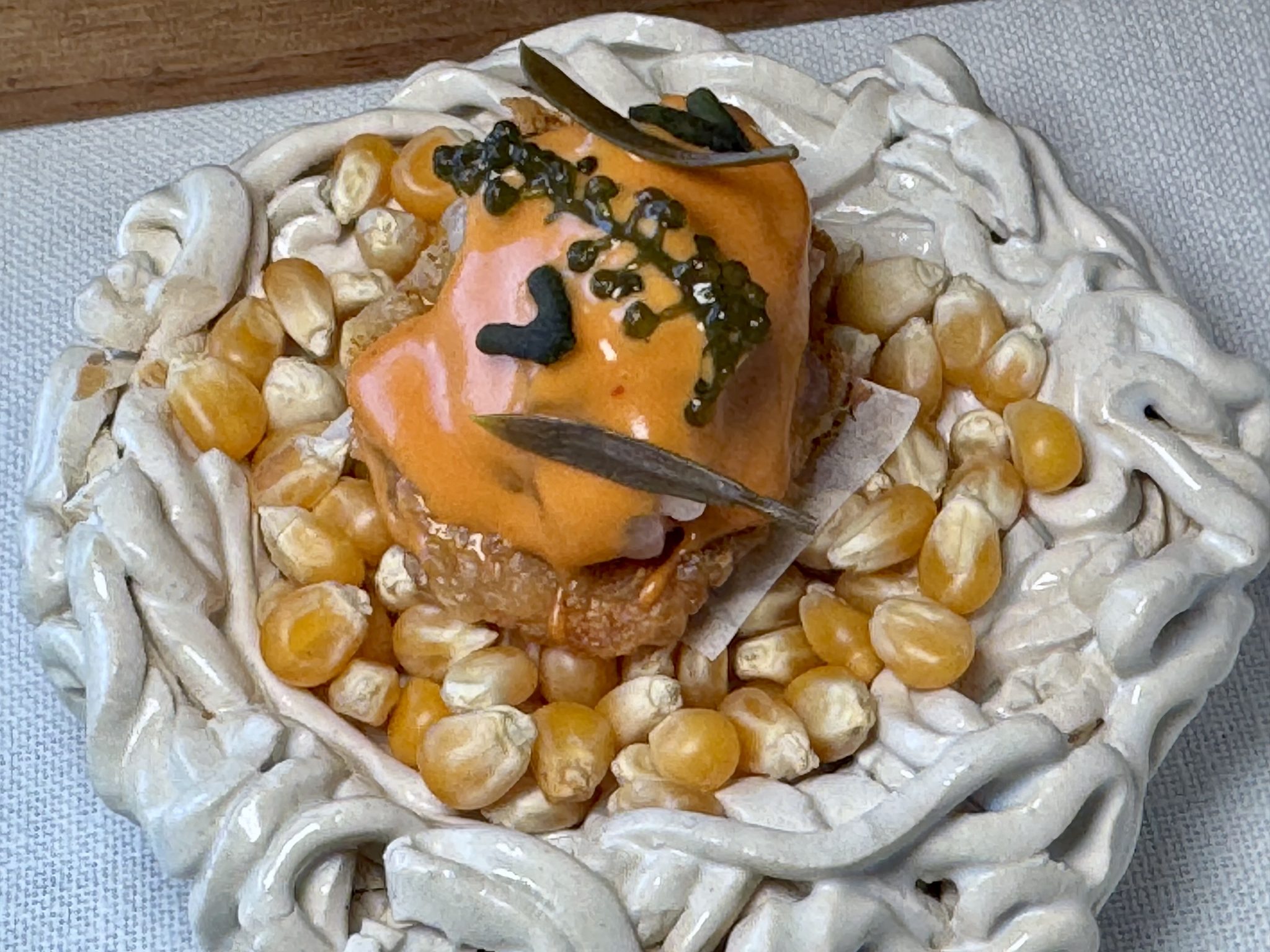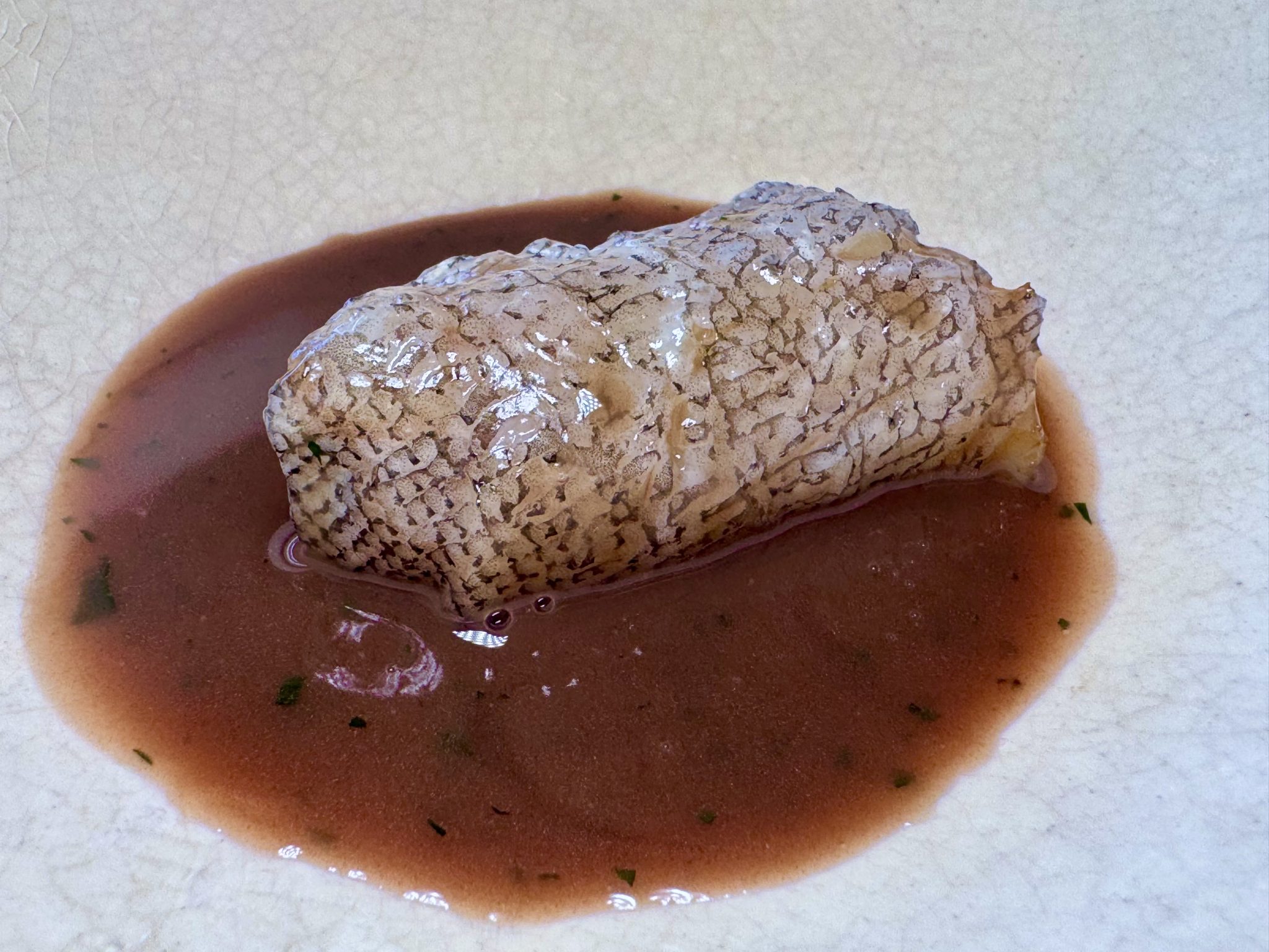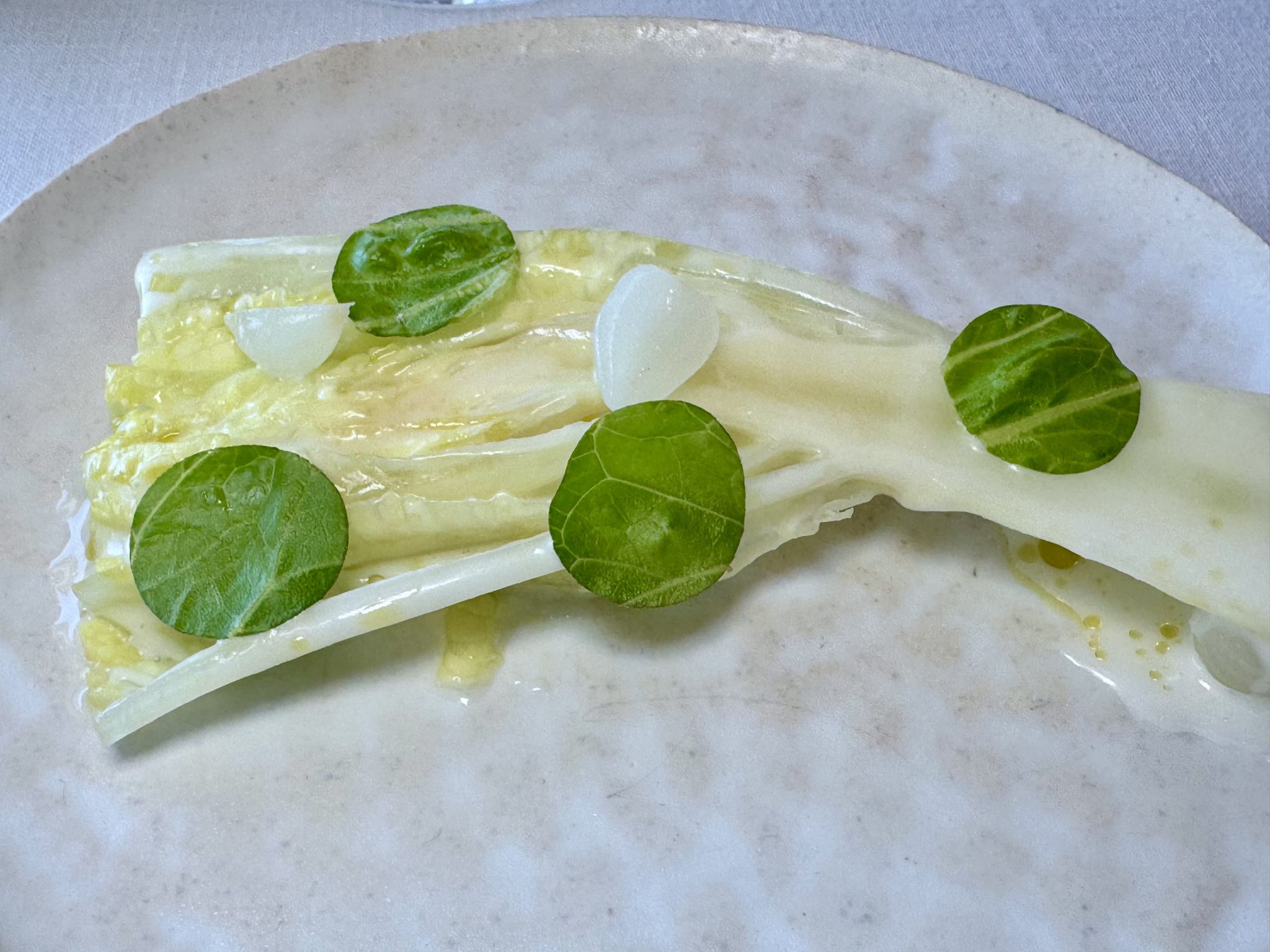Su capacidad para sorprender pasa de los ingredientes pobres a los productos ricos. De la suave espardeña con tinta de calamar, de gusto profundo a las melosas pieles y tripas de bacalao rebosantes de colágeno. Y del pato barberie con nabos, de carne firme, al intrigante canapé de piel de leche con aderezos morunos. O a la lechuga aliñada, tronco vegetal que se mordisquea con agrado entre tantos excesos de proteína.