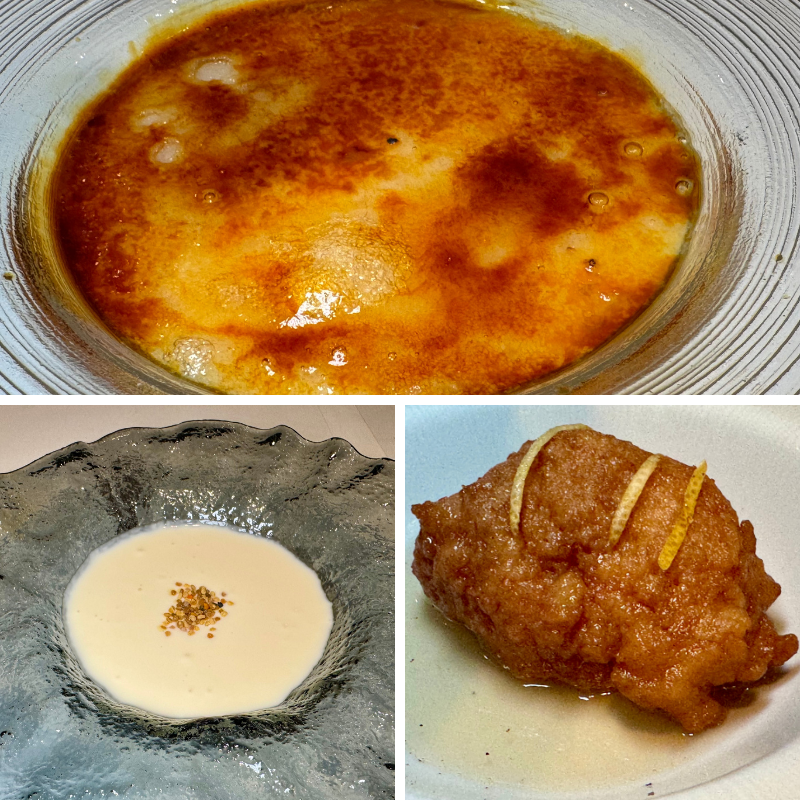 Con los postres rebrota el temido tobogán habitual: notable el arroz con leche al estilo asturiano, con azúcar quemado y notas anisadas; imprescindible la leche presa, crema de yogur desuerada, de enorme delicadeza, y decepcionante el llamado borrachín, duro y reseco, un bizcocho nada borracho necesitado de revisión.