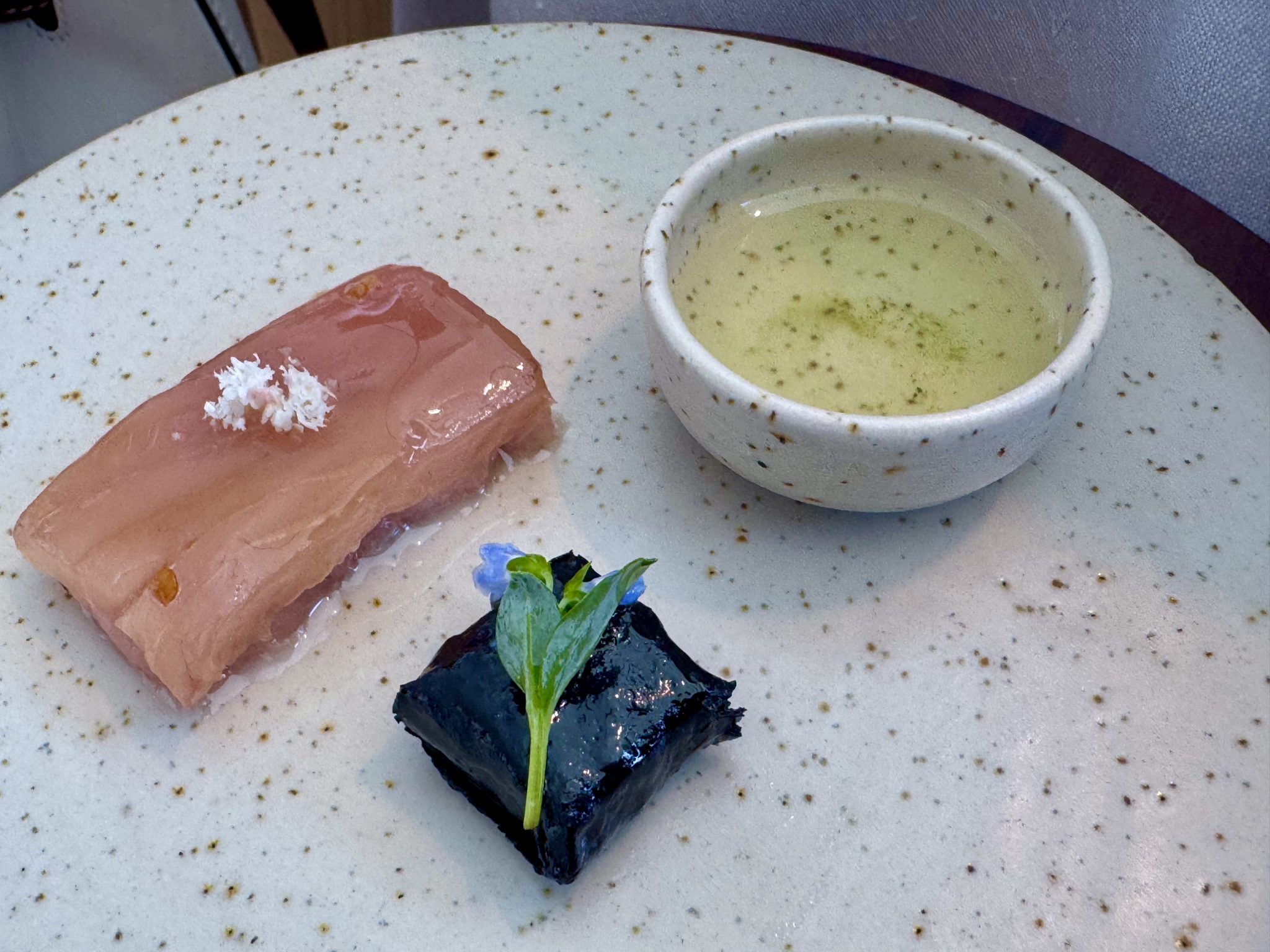 1.- Pan de avena con tapenade vegetal. 2.- Longueiron con hoja de ostra. 3.- Tomate con kombucha de remolacha