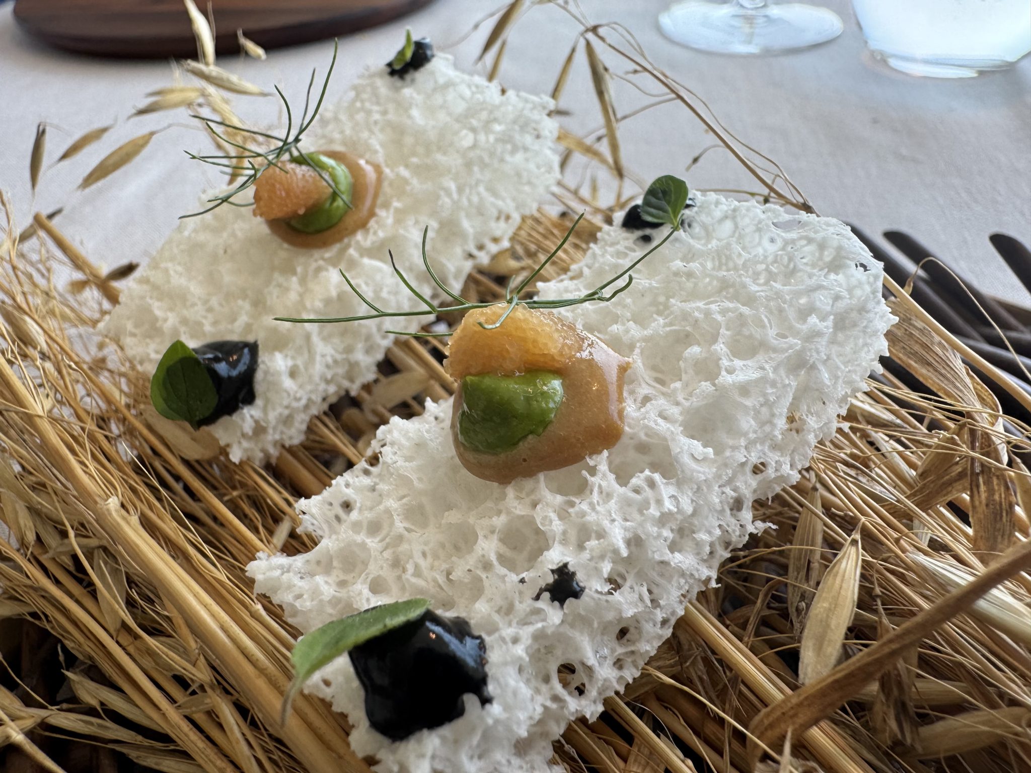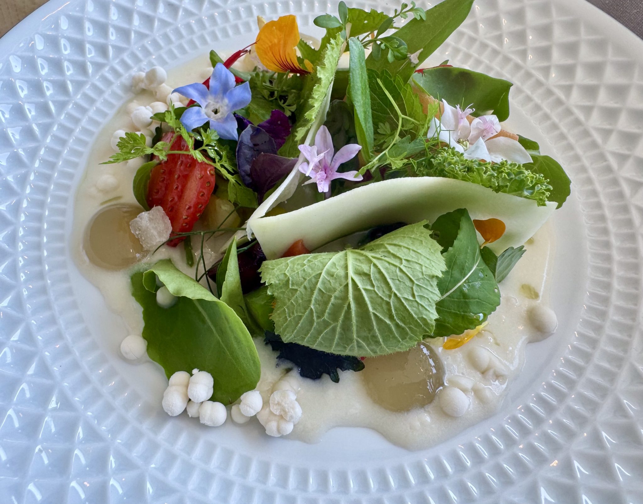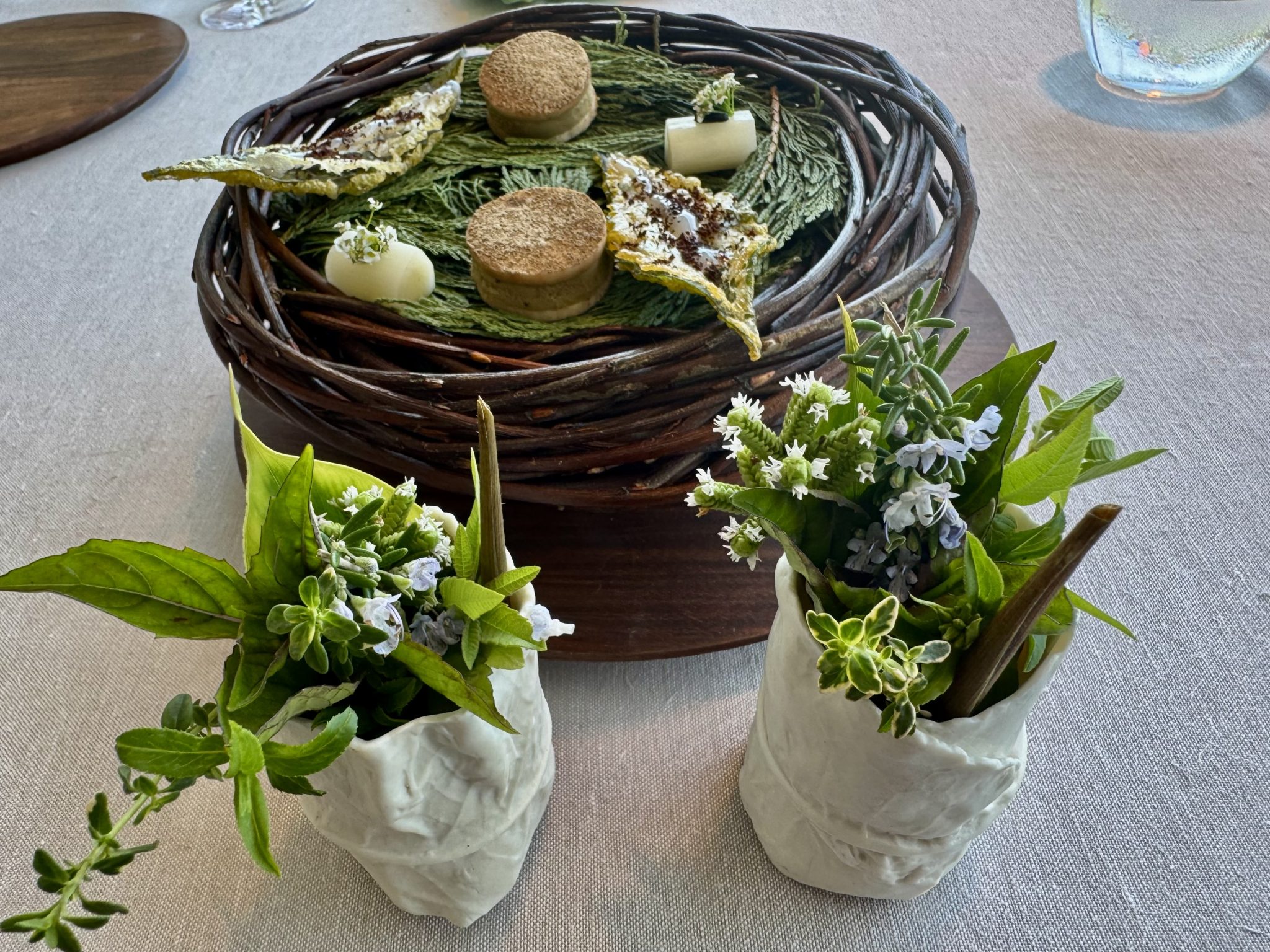 Declaración de intenciones que cobra sentido en los platos que integran cualesquiera de sus tres menús, impredecibles en extensión y formas, sujetos a las temporadas del laboratorio verde que lo rodea. De la refrescante infusión de pepino con ramillete de hierbas, al bocado de champiñones, o las hierbas del huerto con lino y láminas de remolacha. Bocados que despiertan el paladar con sensaciones inesperadas o suscitan preguntas como la hoja de agastaque liofilizada, propia del verano, de una textura que desconcierta.