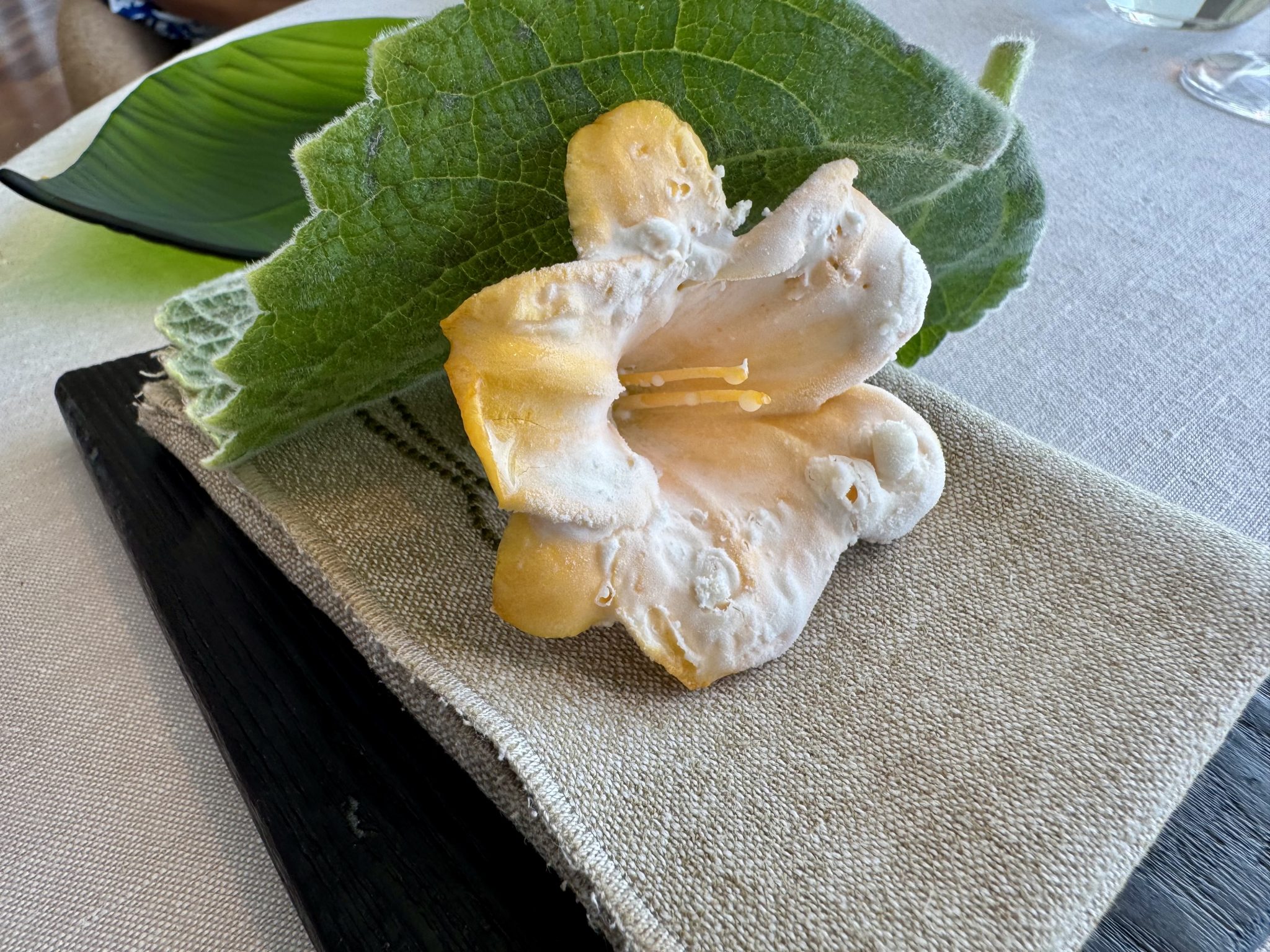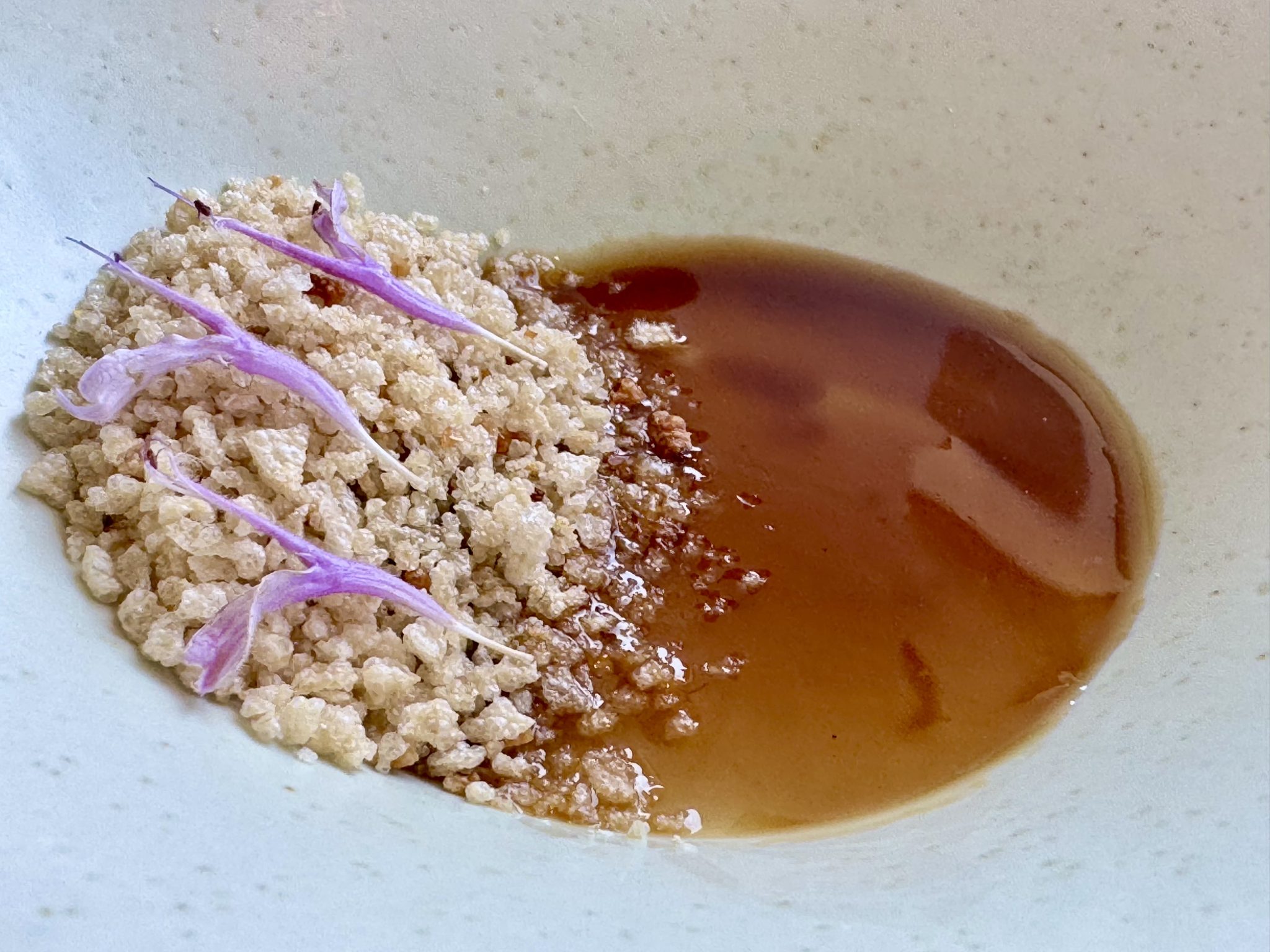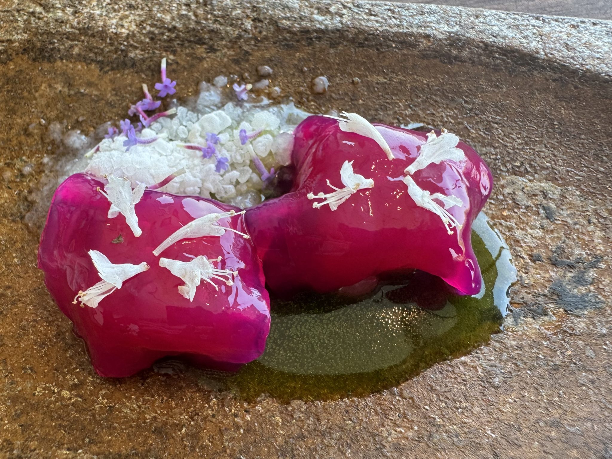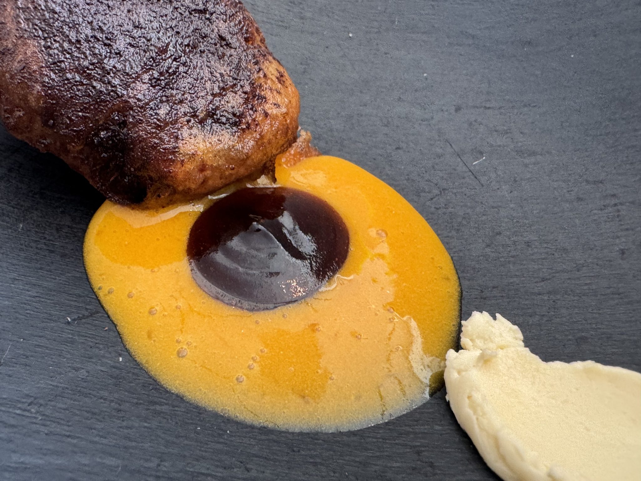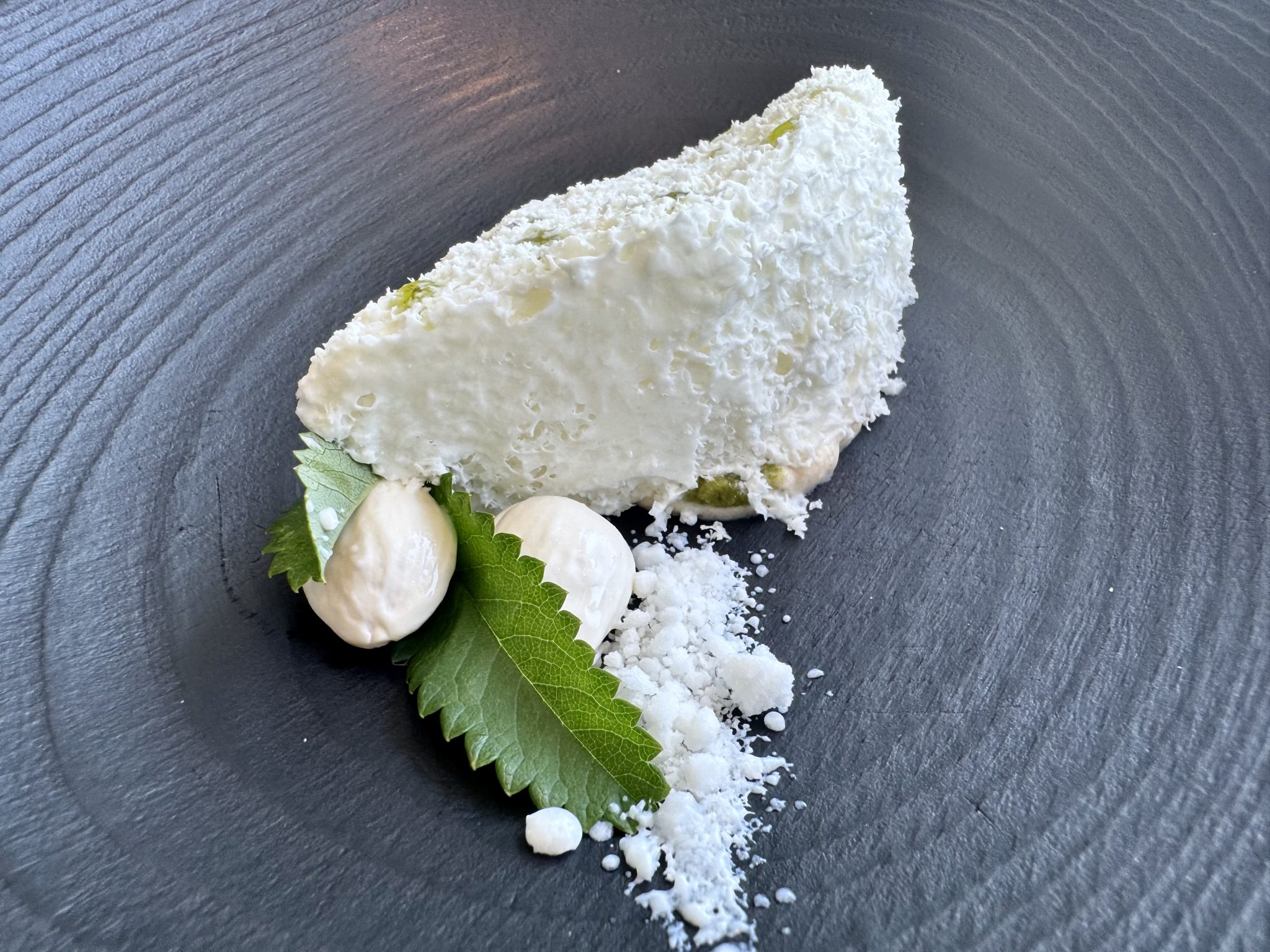 No menos sugerente que el tomate con kombucha de remolacha y granizado ácido, o el pan de avena con tapenade vegetal y hueva de pescado, ambos con la ligereza del aire. Por su parte la hoja de ostra acentúa el tono yodado del longueiron al que acompaña, y el suero con hechuras de queso proporciona la sensación de un lácteo convertido en nube. Cocina sencilla en apariencia, pero refinadamente compleja dentro de su radical minimalismo, con un arsenal de registros y matices ocultos que entusiasma.