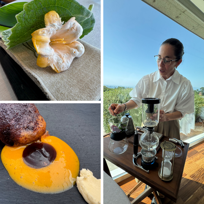 1.- Lino bañado en vinagreta del miel. 2.- Piel dulce. 3.- Preparación del café en sala.