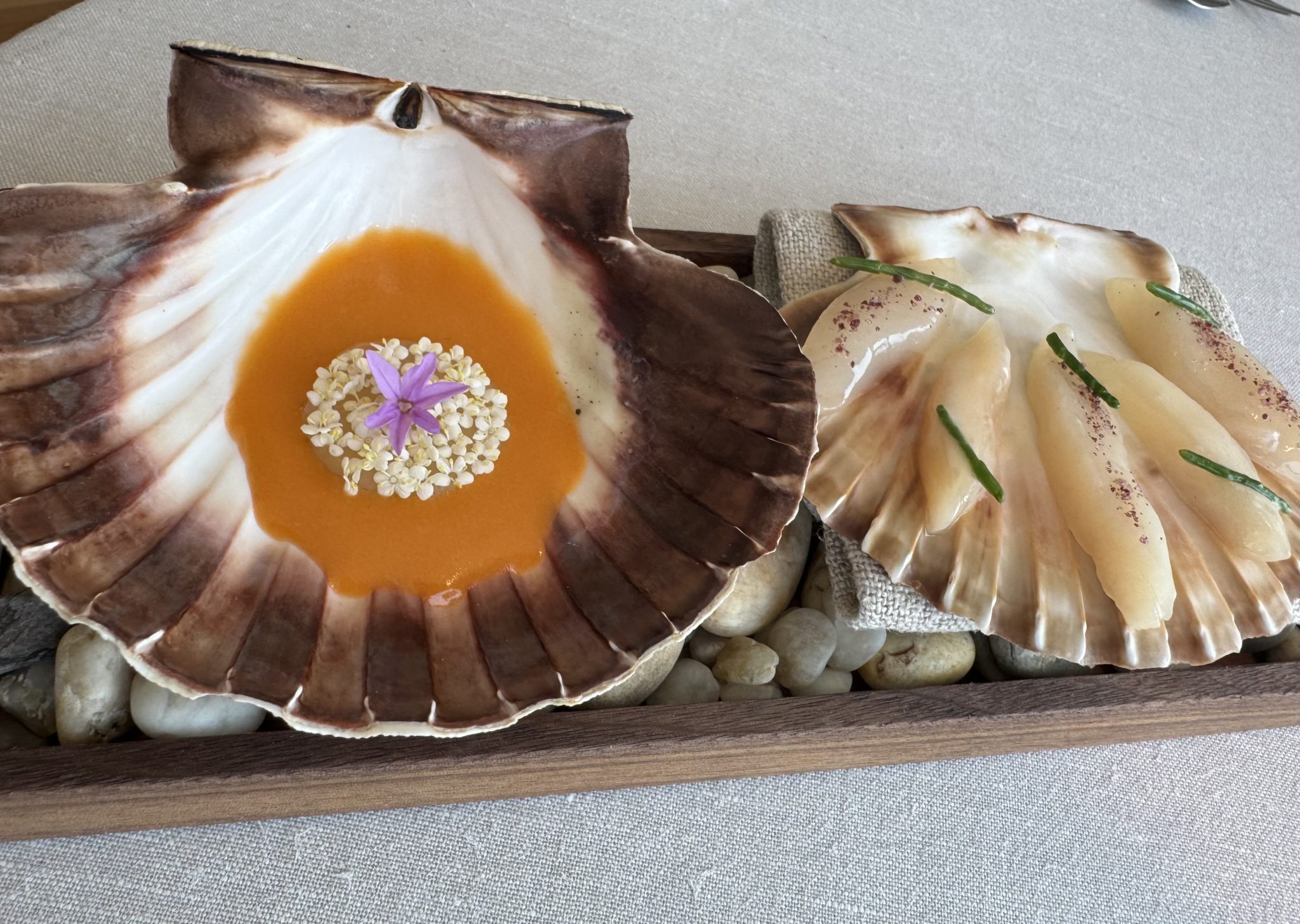 Por su menú “Descubierta”, marcadamente vegetal, desfilan hierbas, espárragos blancos, longueirones, almendras tiernas, cebollas, vieiras, maíz tierno, bonito, algas y calabacines, entre otros bocados. Una cocina viva, chispeante y sentida que mira a la ría próxima y a la huerta que lo rodea a contracorriente de los dictados de la gran hostelería gallega, tradicionalmente de espaldas al universo verde. Se cumplen 15 años desde que, en compañía de su mujer, Amaranta Rodríguez inaugurase este restaurante en un rincón frente a la ría de Arousa.