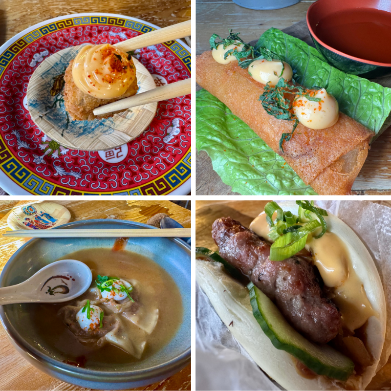 1.- Croqueta asiática. 2.- Rollito primavera. 3.- Empanadillas al vapor rellenas de langostinos y panceta. 4.- Bao de butifarra.