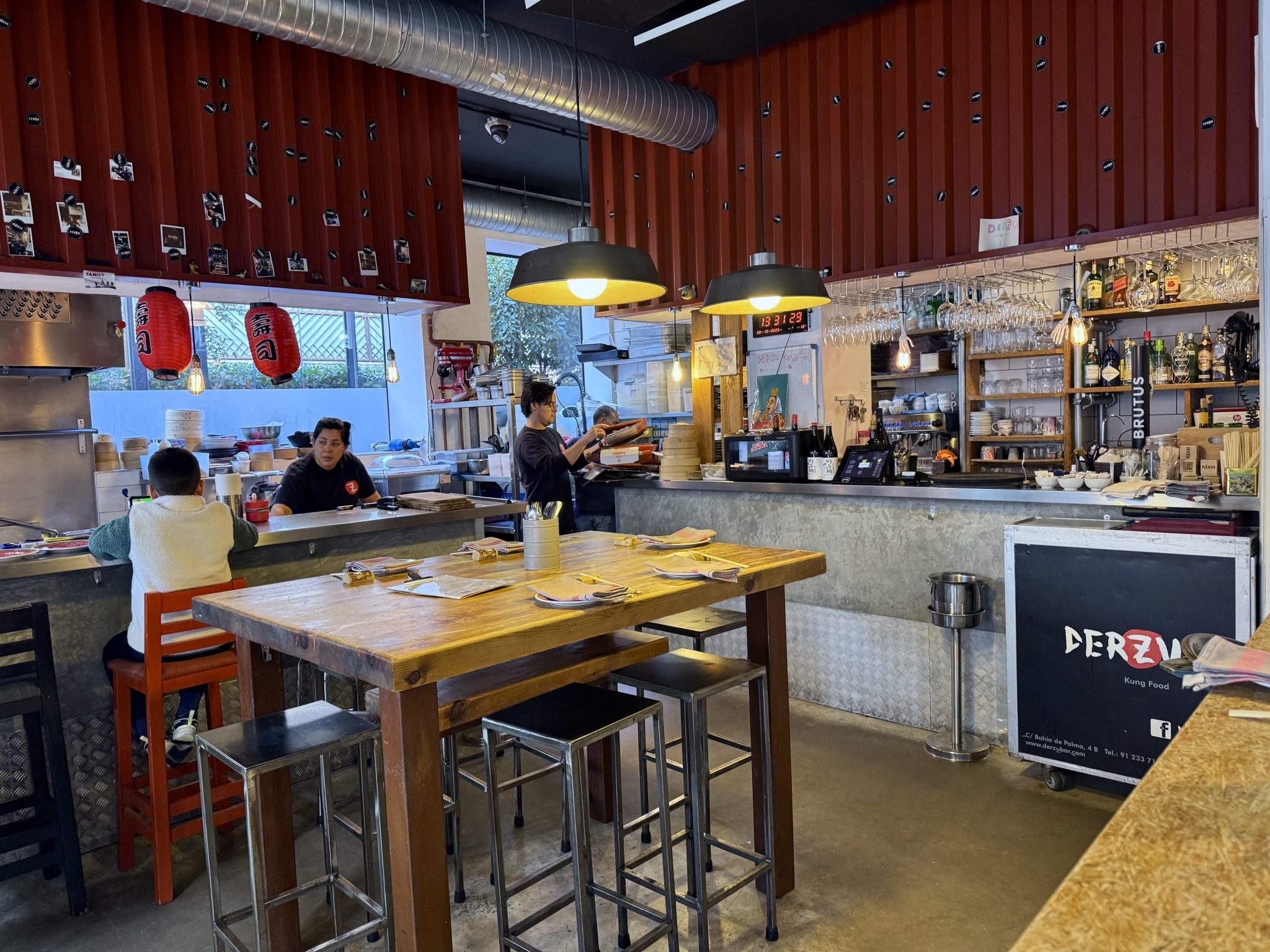 En Derzu Bar (Barajas. Madrid), símil de una taberna asiática, la carta es breve, los precios amables y el ambiente desenfadado. A ritmo incesante una música techno acompaña a recetas orientales que se elaboran al momento. Detrás de su minúscula barra abierta al pequeño comedor de la que fluyen llamaradas del wok, deambulan tres risueños profesionales, Diego, César y Geraldine. En sus platos, de corte callejero y presentaciones previsibles, asoman productos y sabores de España, China, Tailandia y Japón. Todo un ejercicio de fusión. En horas punta el ajetreo es incesante y el local se llena a reventar. Sobre mesitas altas con taburetes los comensales optan por las especialidades de la casa. Un desfile de propuestas entre las que no faltan los noodles, los arroces orientales, las costillas asadas, los crispy burger, e incluso los cortes de vacío de vacuno mayor.