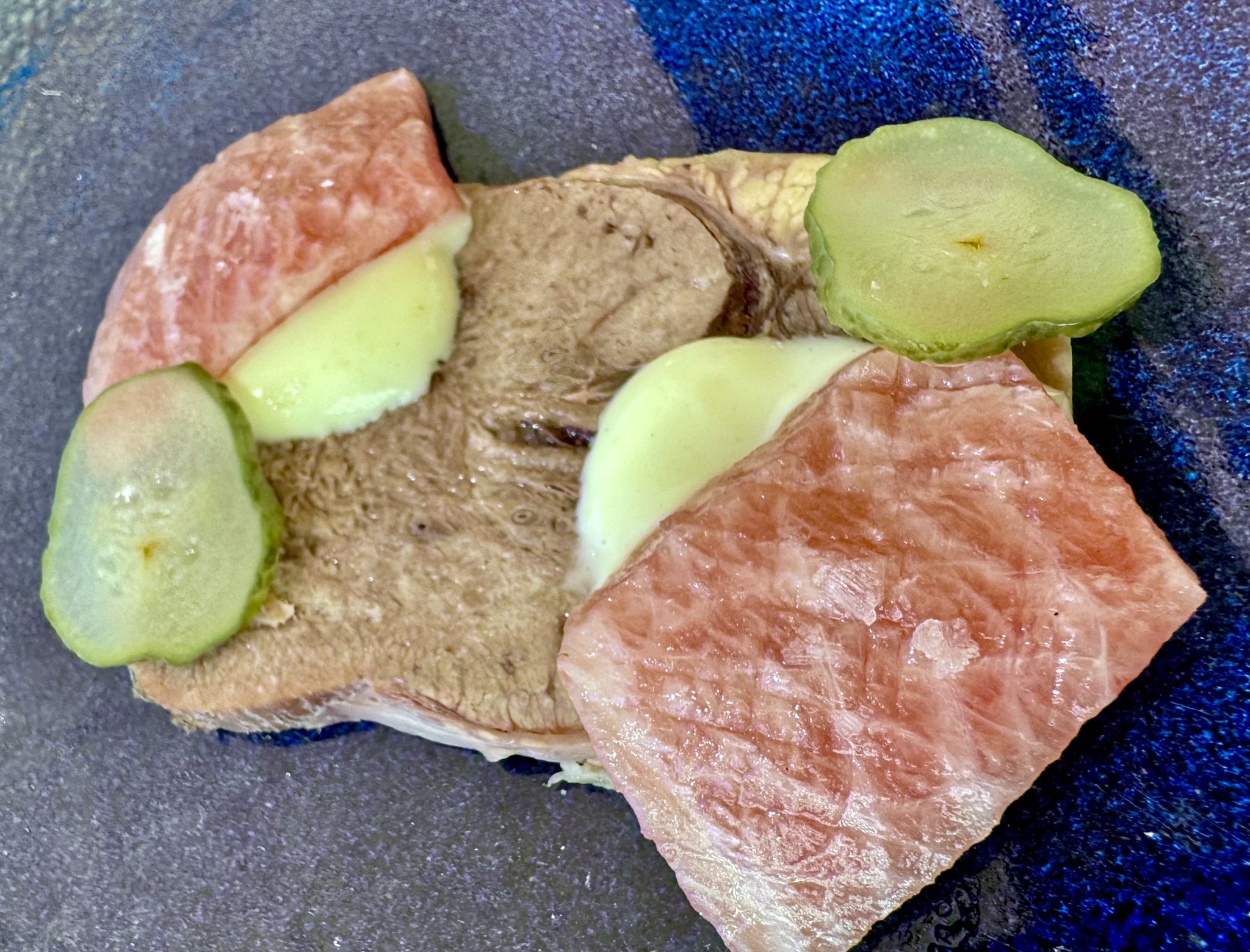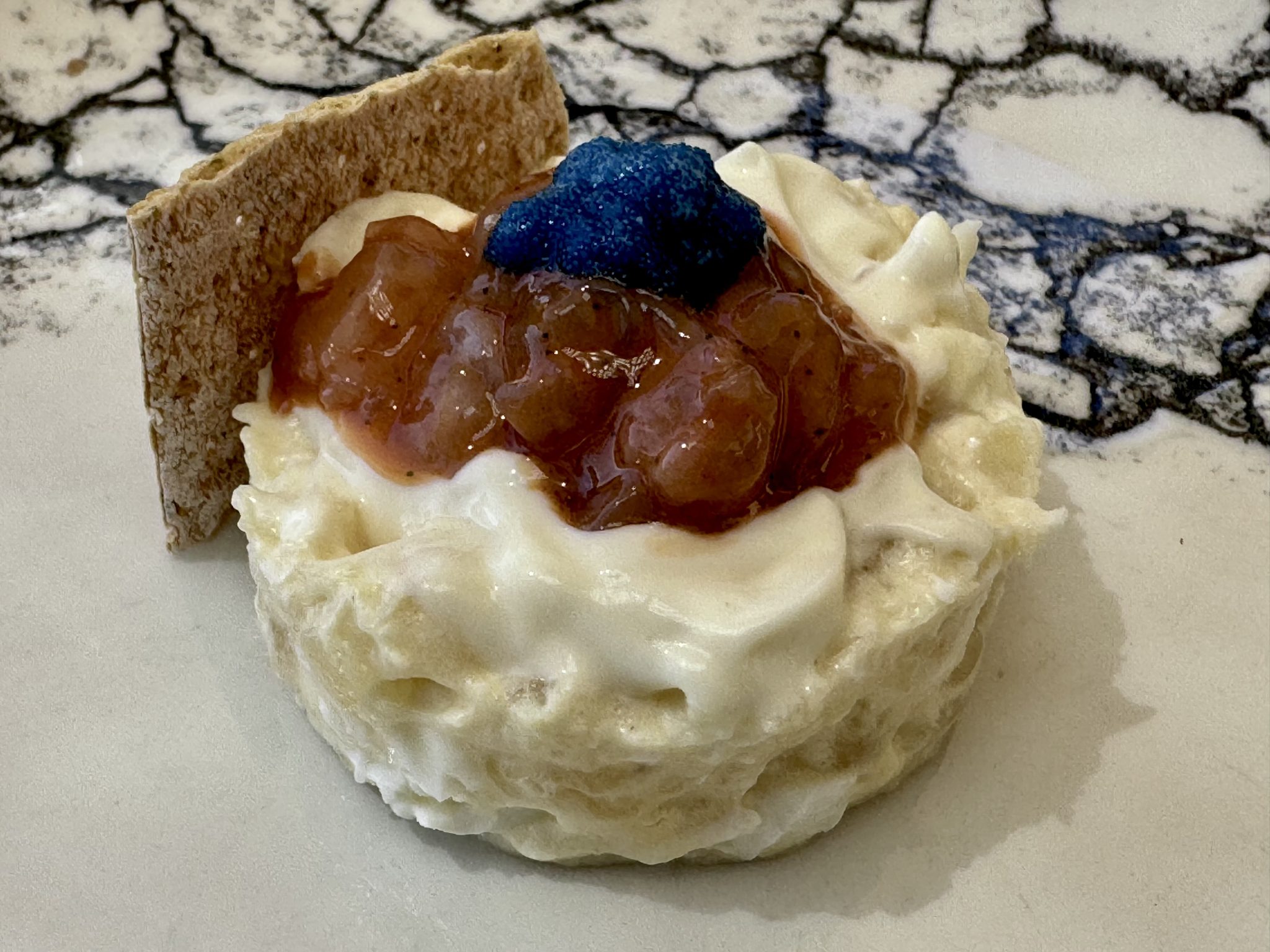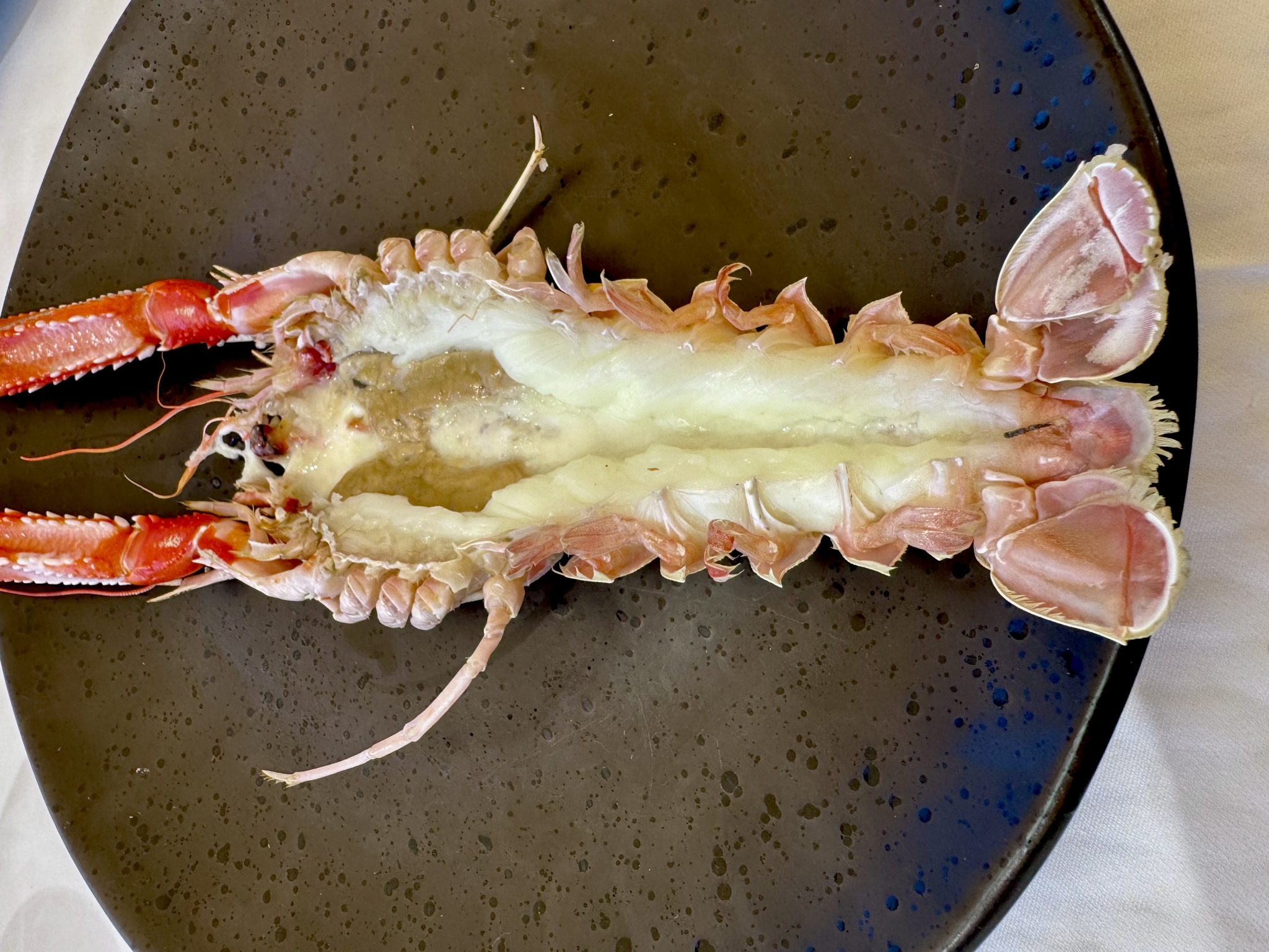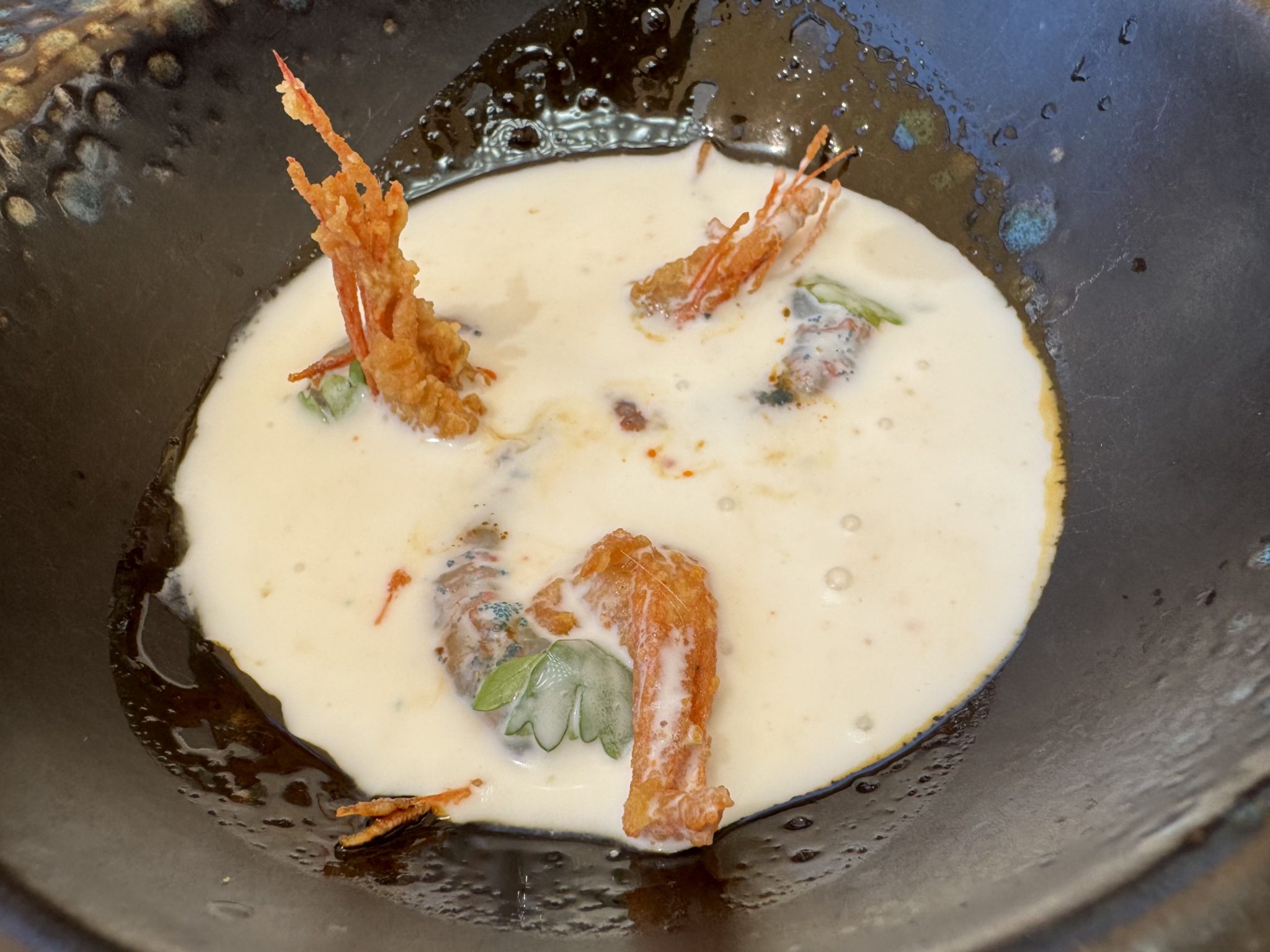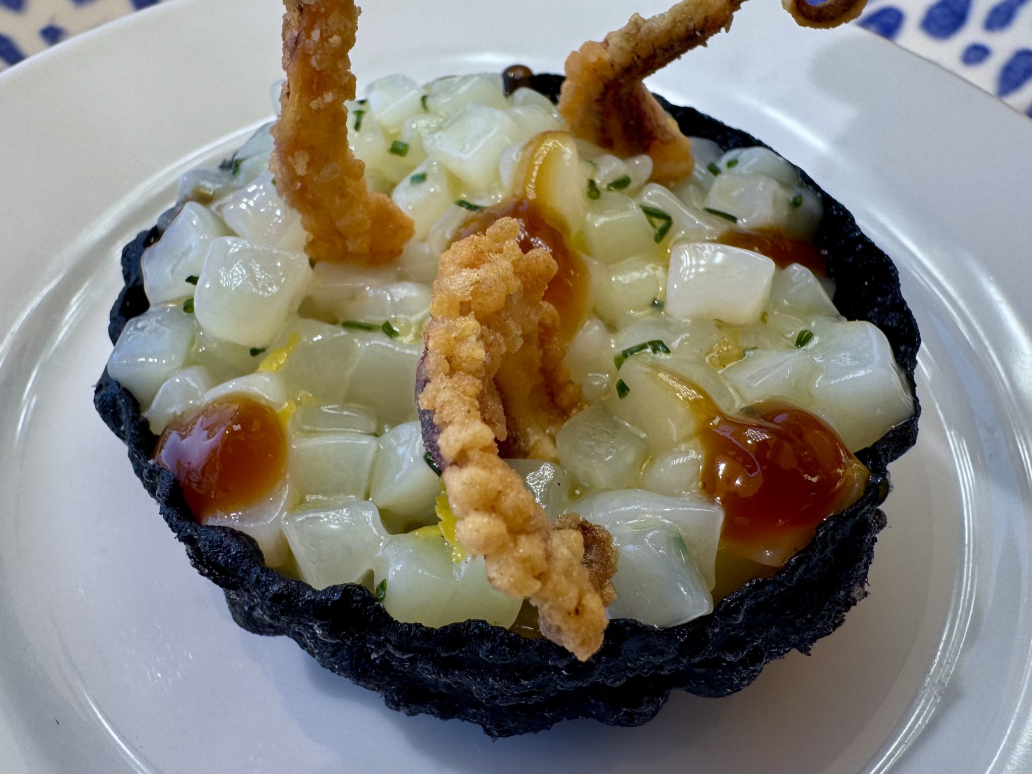 Listado donde militan bocados tan radicalmente simples como los tomates huevo toro, de escasa relevancia, aliñados con aceite de albahaca y anchoas; o su poco afortunada versión del vitello tonnato con fiambre de lengua de vaca, ventresca de atún y pepino encurtido, un conjunto que chirría. ¿A cuento de qué esa manía tan generalizada de adjudicar enunciados conocidos a recetas personales que nada tienen que ver con las fórmulas originales? Y a modo de contrapunto un plato excelente: quisquillas crudas con sus patitas fritas y leche de coco acebichada.