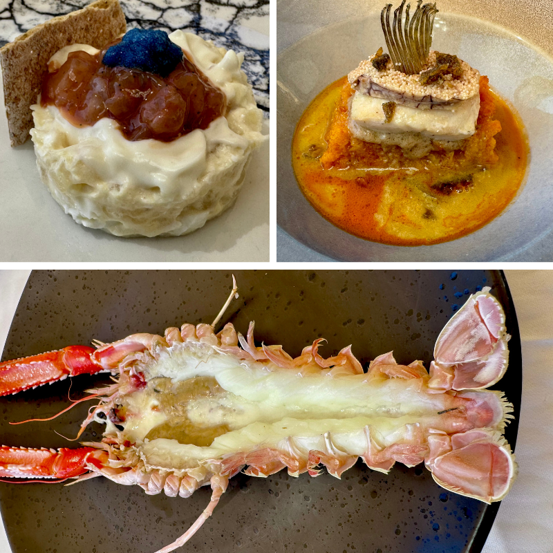 1.- Ensaladilla de quisquillas. 2.- Sopa de pan con pez San Pedro. 3.- Cigala de tronco a la plancha.
