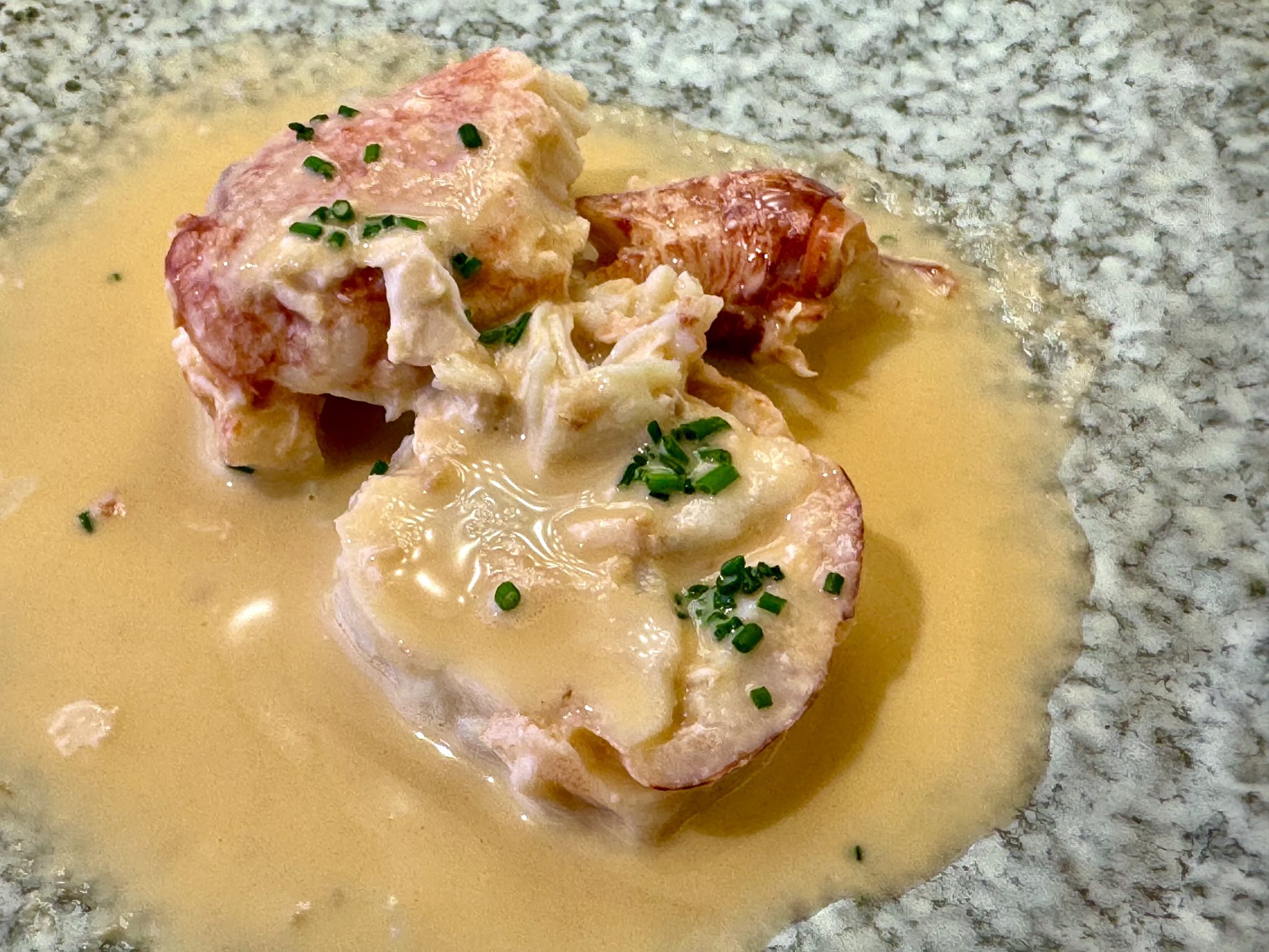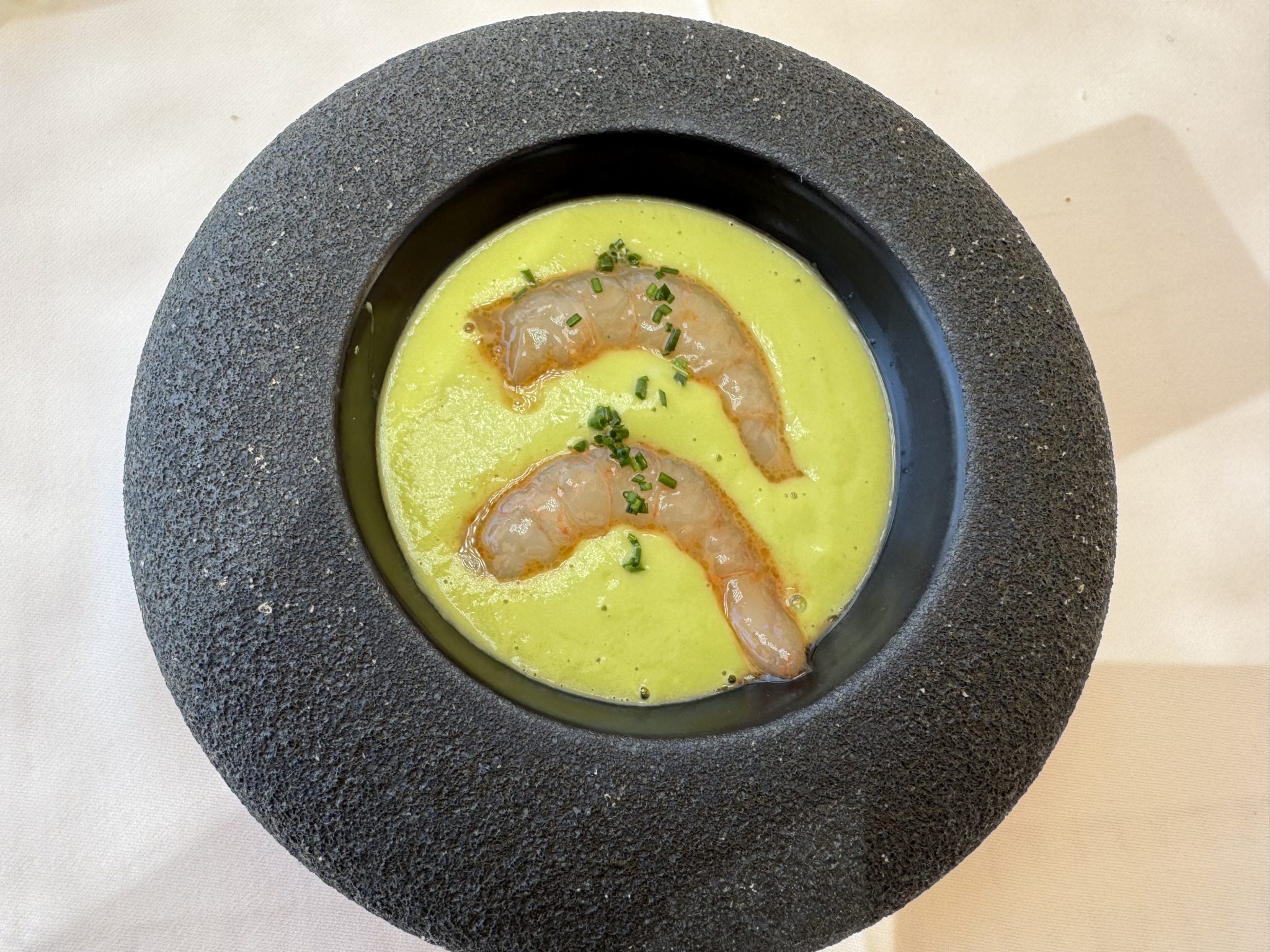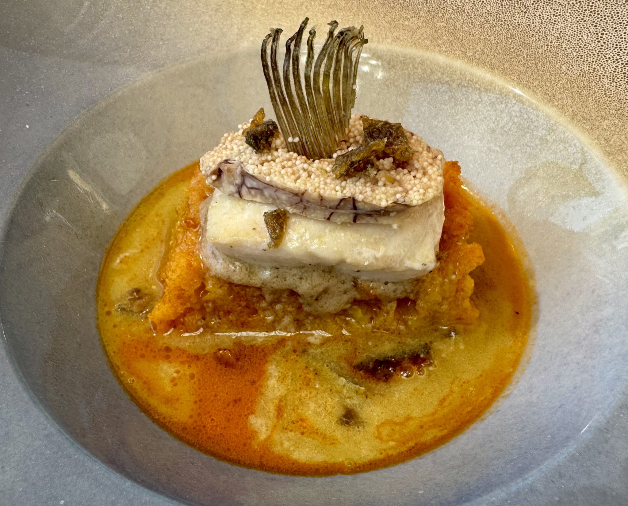 No desmerece en absoluto su refinada ensaladilla de quisquillas, que se desmarca de la media. Tan lograda como el salpicón de bogavante gallego o la sopa de pan con pez San Pedro, plato con el que consiguió el primer premio en el concurso “Cocinando el Mar” en Madrid Fusión hace cuatro años. Precisión que, sin embargo, debido tal vez a la aceleración de sus cocinas no se mantiene en la cigala de tronco a la plancha, asada a la unilateral, que llega a la mesa ligeramente pasada de punto.