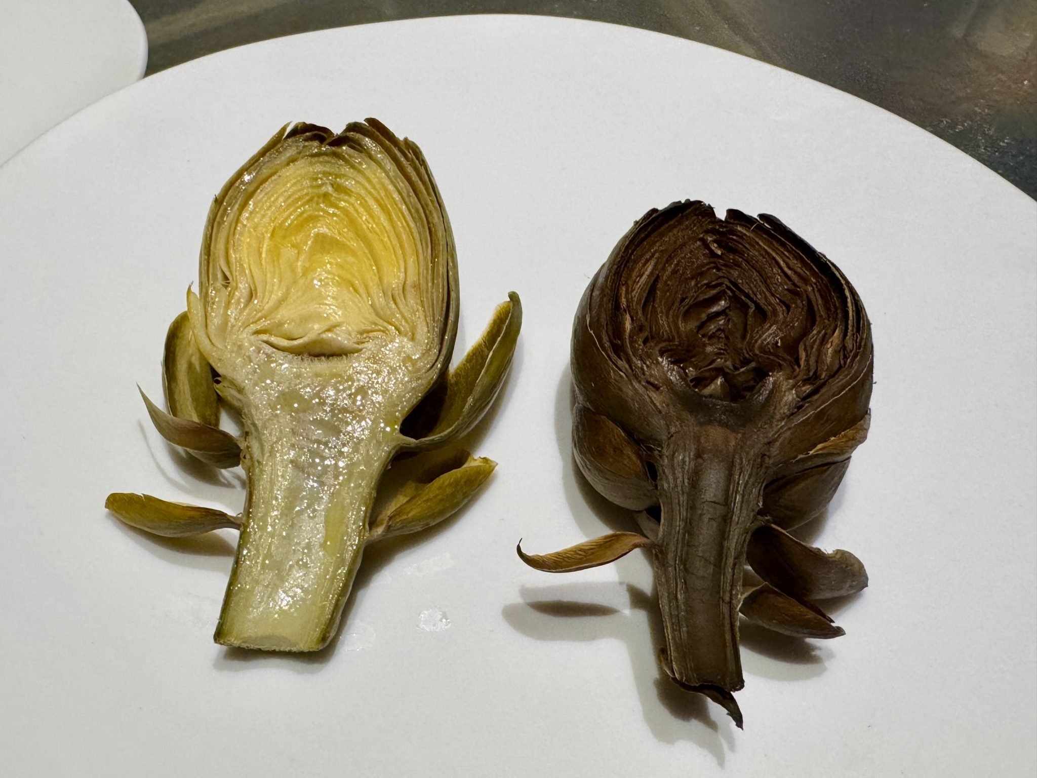1.- Alcachofa blanca y negra. 2.- Colmenillas con salsa de ternera thai