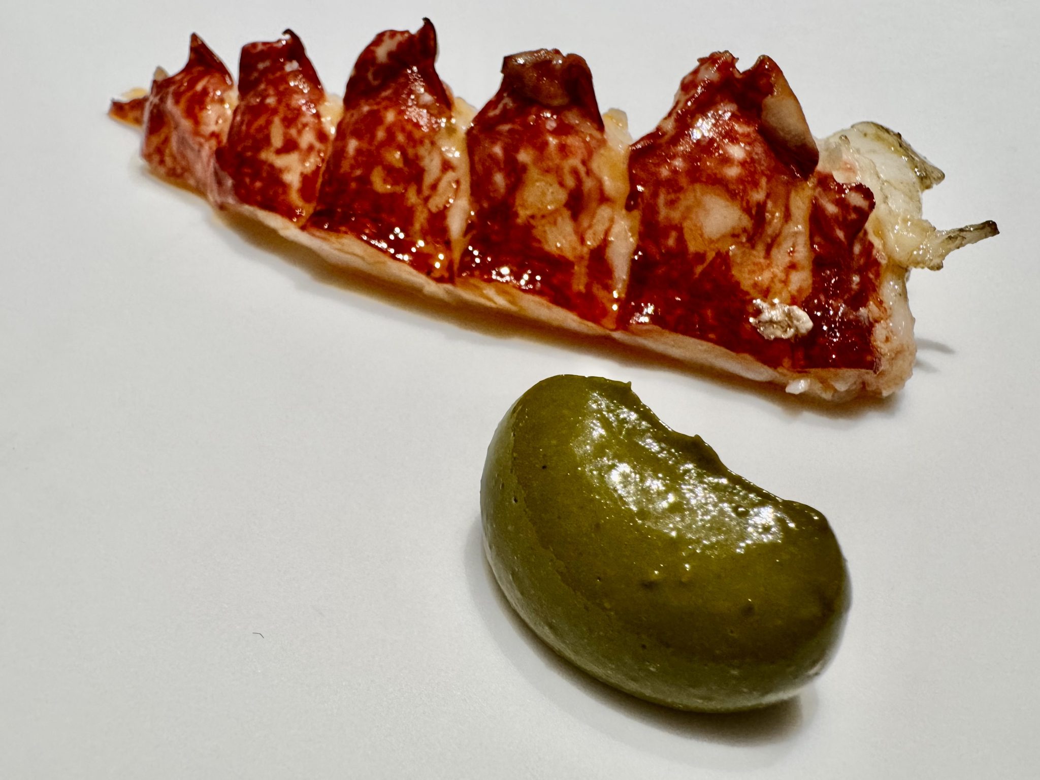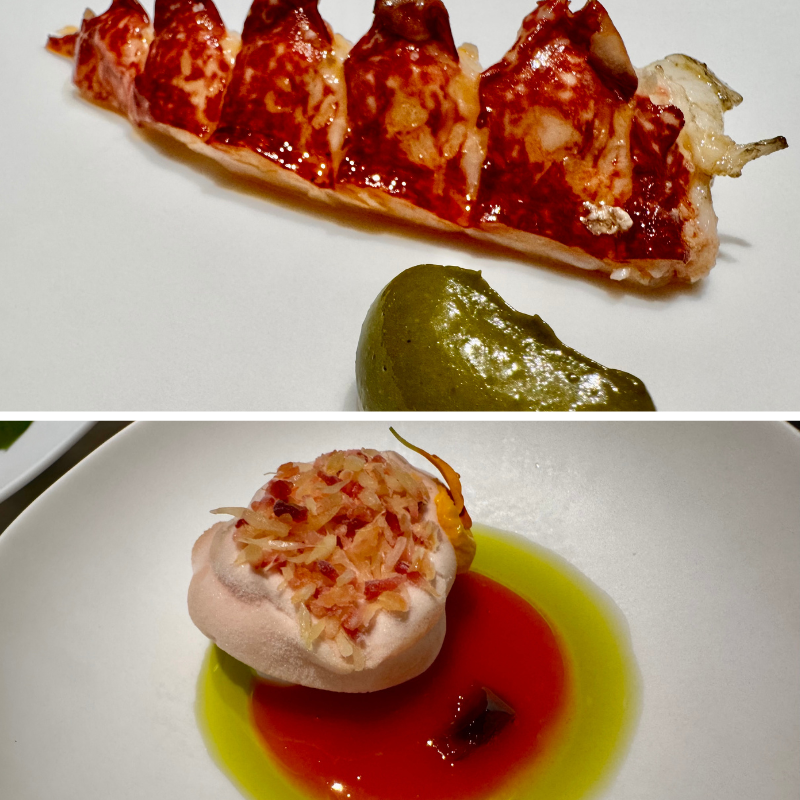 1.- Bogavante asado con quenelle de su coral. 2.- Espuma helada de naranja sanguina.