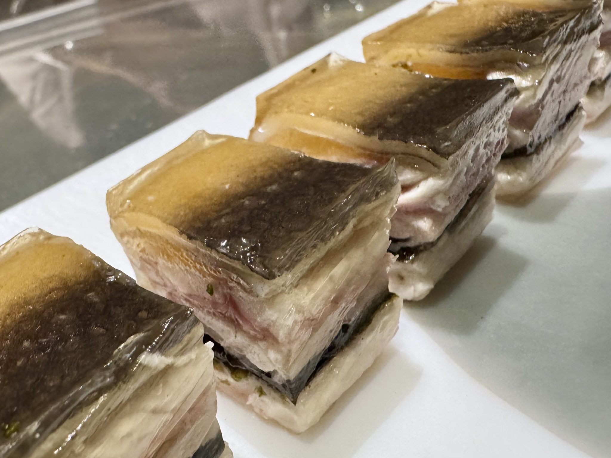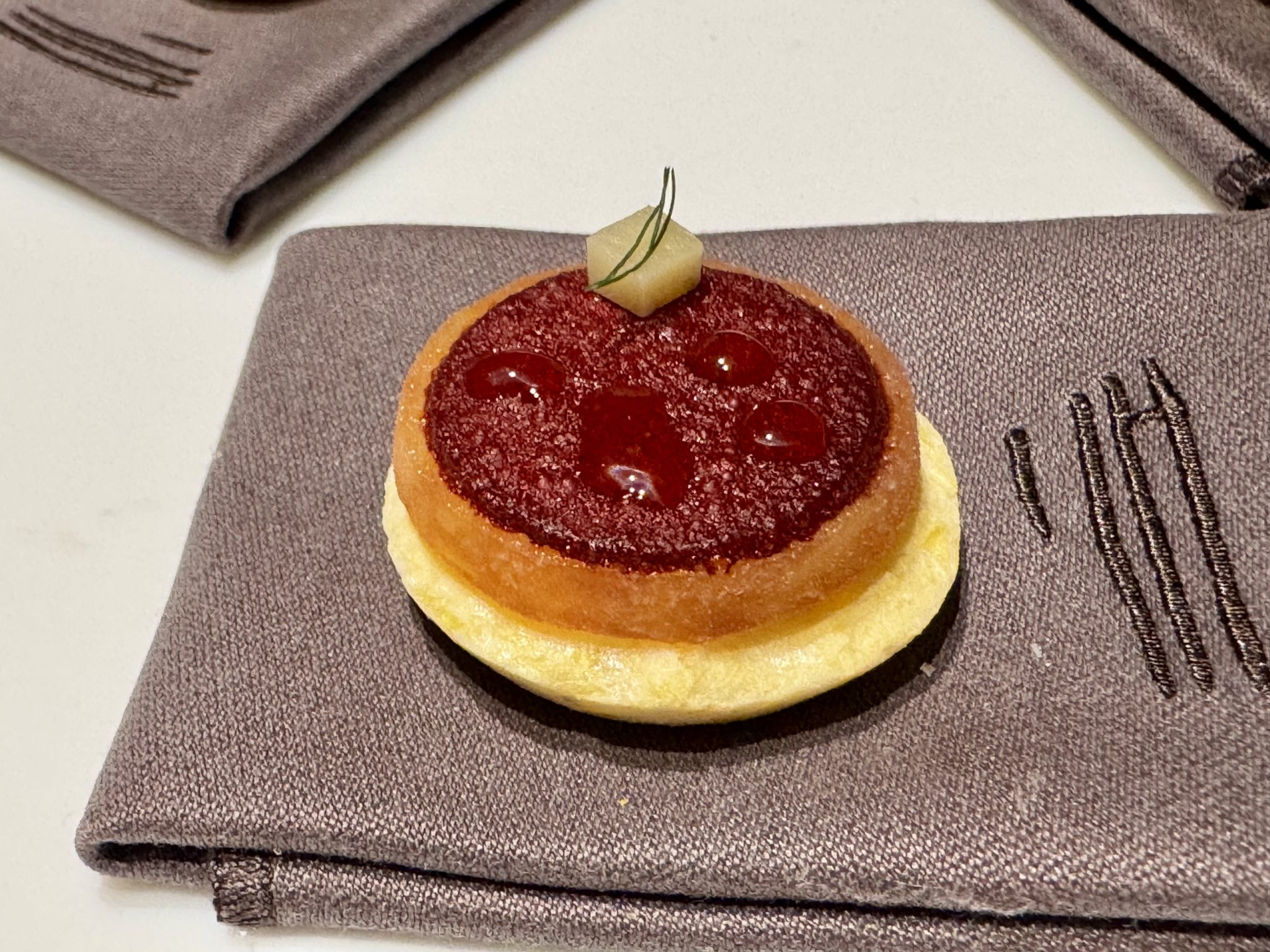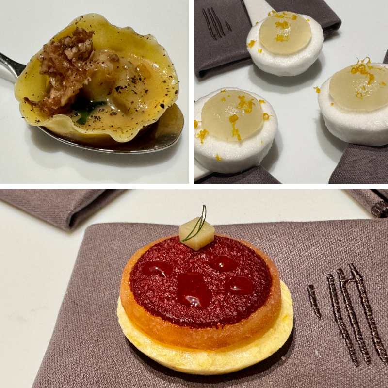 1.- Gelatina de berenjena, sobrasada y erizo de mar. 2.- Terrina de anguila ahumada. 3.- Guisante lágrima en vaina de judía verde. 3.- Airwaffle de parmesano