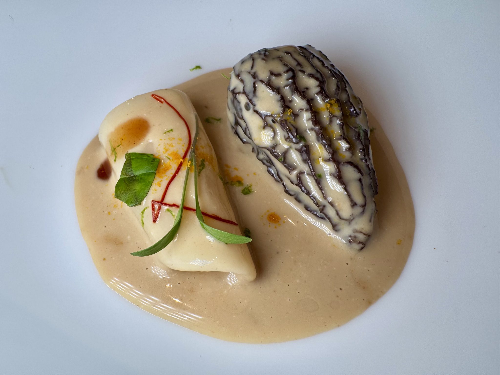 Dos mitades de alcachofa, blanca y negra, una hervida y a la brasa, y otra tratada en la olla coreana Occo, ennegrecida por oxidación enzimática, nos mostraban dos mordidas y sabores antagónicos a partir de un mismo producto. Tan sugerente como las colmenillas a la salsa de ternera thai con láminas de coco verde que apuntaban de forma equívoca a la textura de un calamar de media cocción. El menú proseguía alternando los habituales picos y valles que caracterizan a los menús sutilmente diseñados.