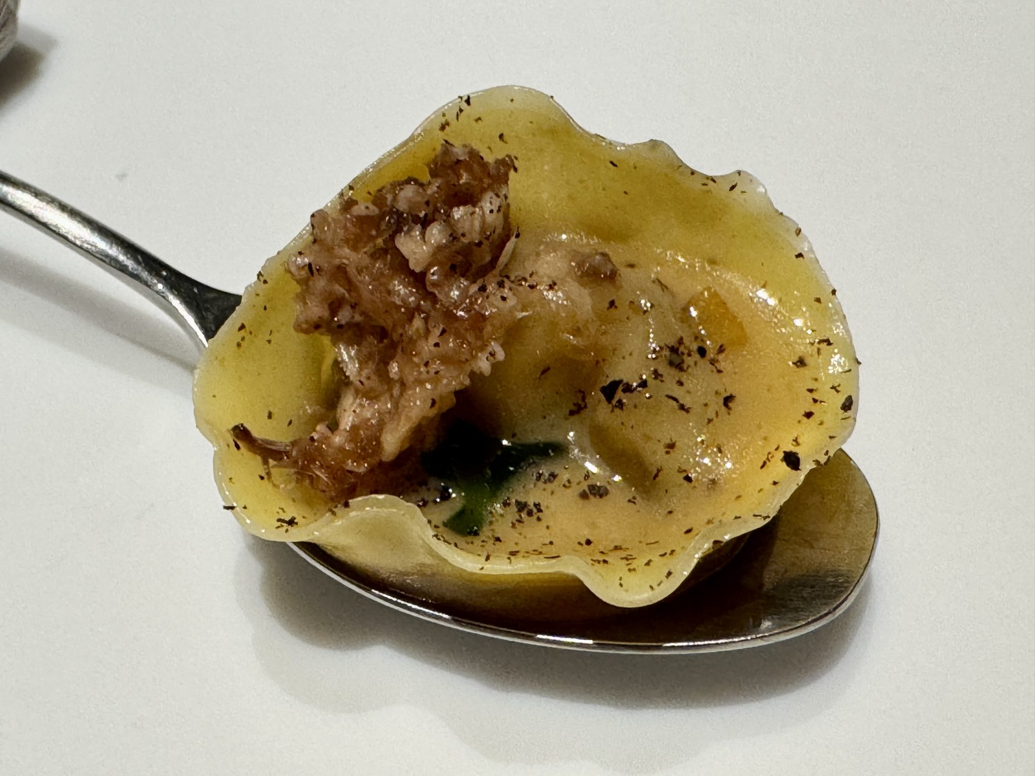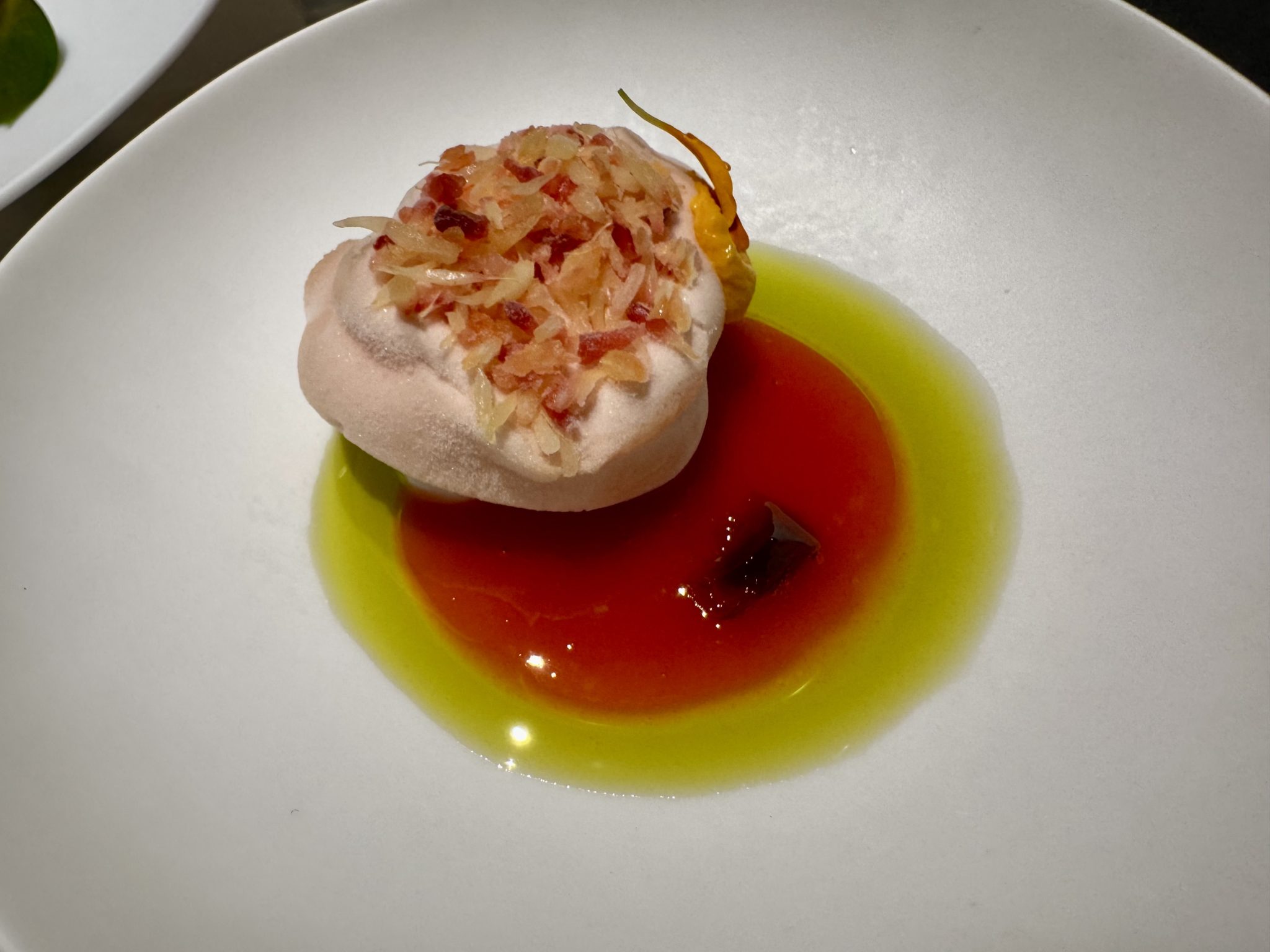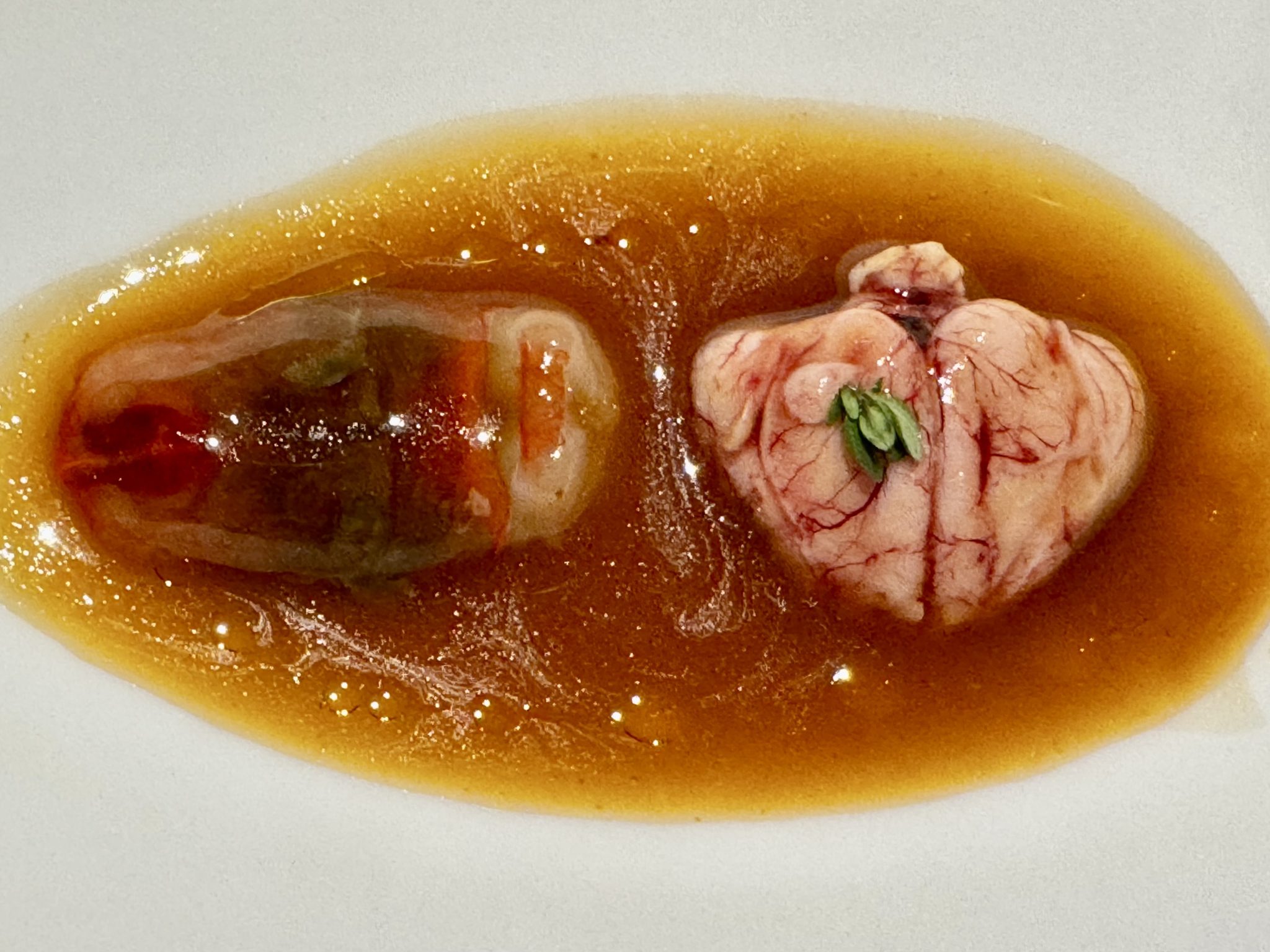 Con el atrevido escabeche de sesos de conejo y de gambas, un mar y montaña extraño, confluencia de dos masas melifluas y visualmente impactantes extraídas con bisturí de un mamífero y un crustáceo, Adrià nos obligaba a superar cualquier prejuicio. Y con la gelatina de tuétano de ternera con caviar ahumado, con el plus de una salsa de las lentejas-caviar guisadas convertía en duda, que no en trampantojo, la conocida armonía de su hermano Ferran. Un juego sápido y visual que se multiplicó con los mochis de frambuesa que tras un sutil cocinado adoptan la forma de tiras de pimientos del piquillo y saben casi igual por efecto de la salsa de pimientos con la que se cubren. De nuevo, texturas y sabores a las puertas del juego, con detalles de desconcierto y un refinado sentido de la provocación.