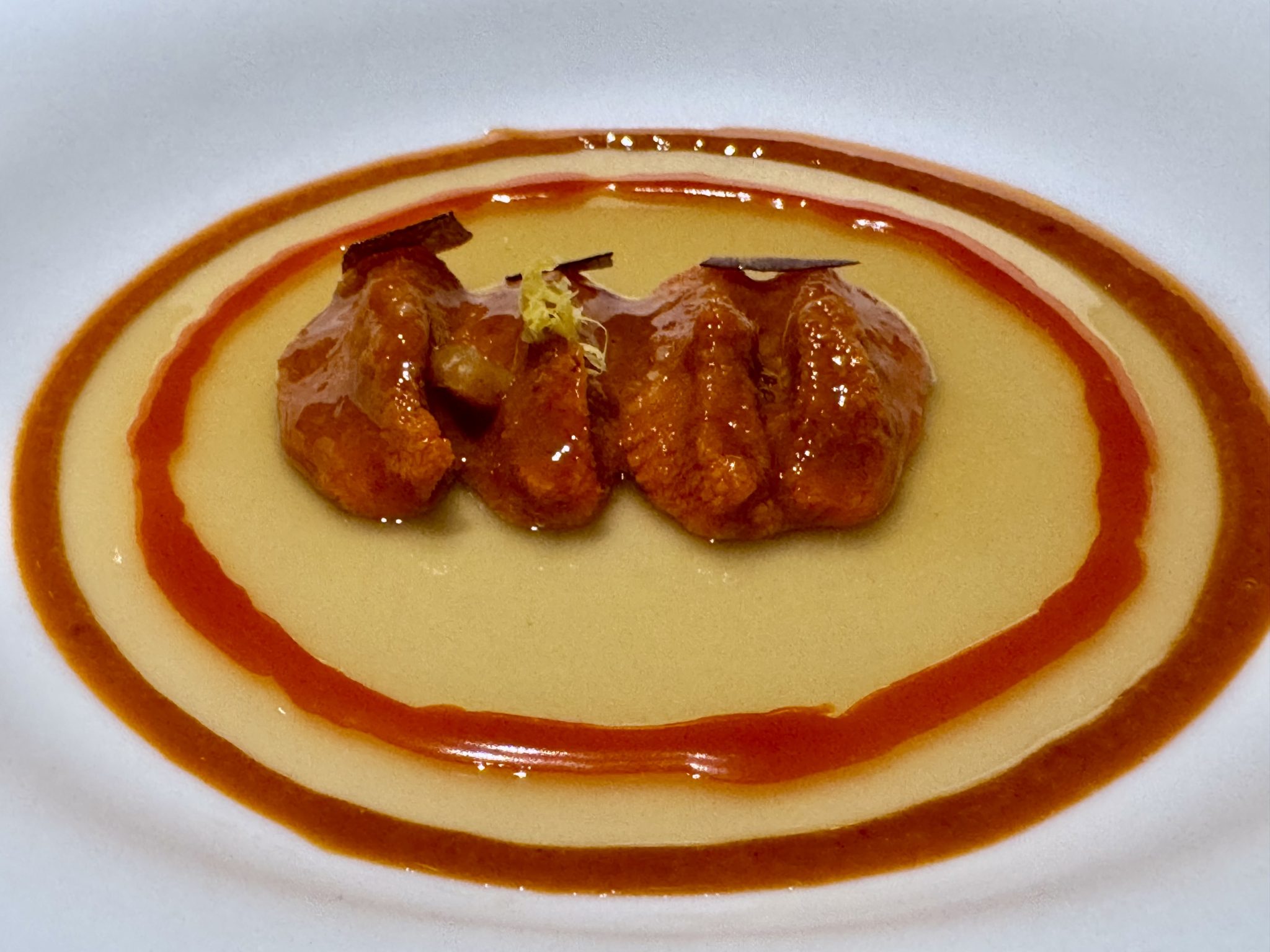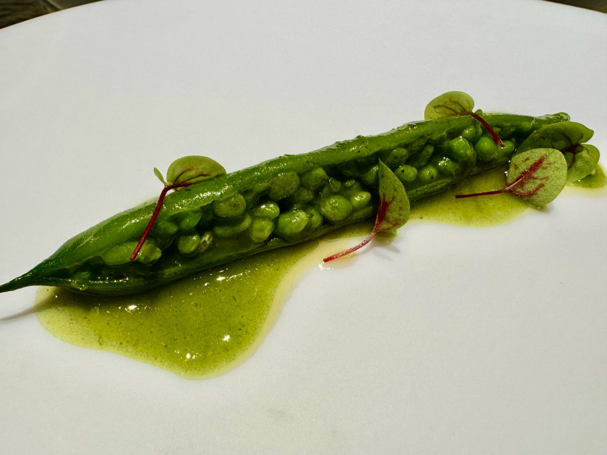 A los erizos marinos sobre gelatina de berenjena y salsa de sobrasada, de textura mórbida, siguieron la tarrina de anguila ahumada, y más tarde los guisantes lagrima del Maresme encerrados en vainas de judías verdes, una explosión vegetal.