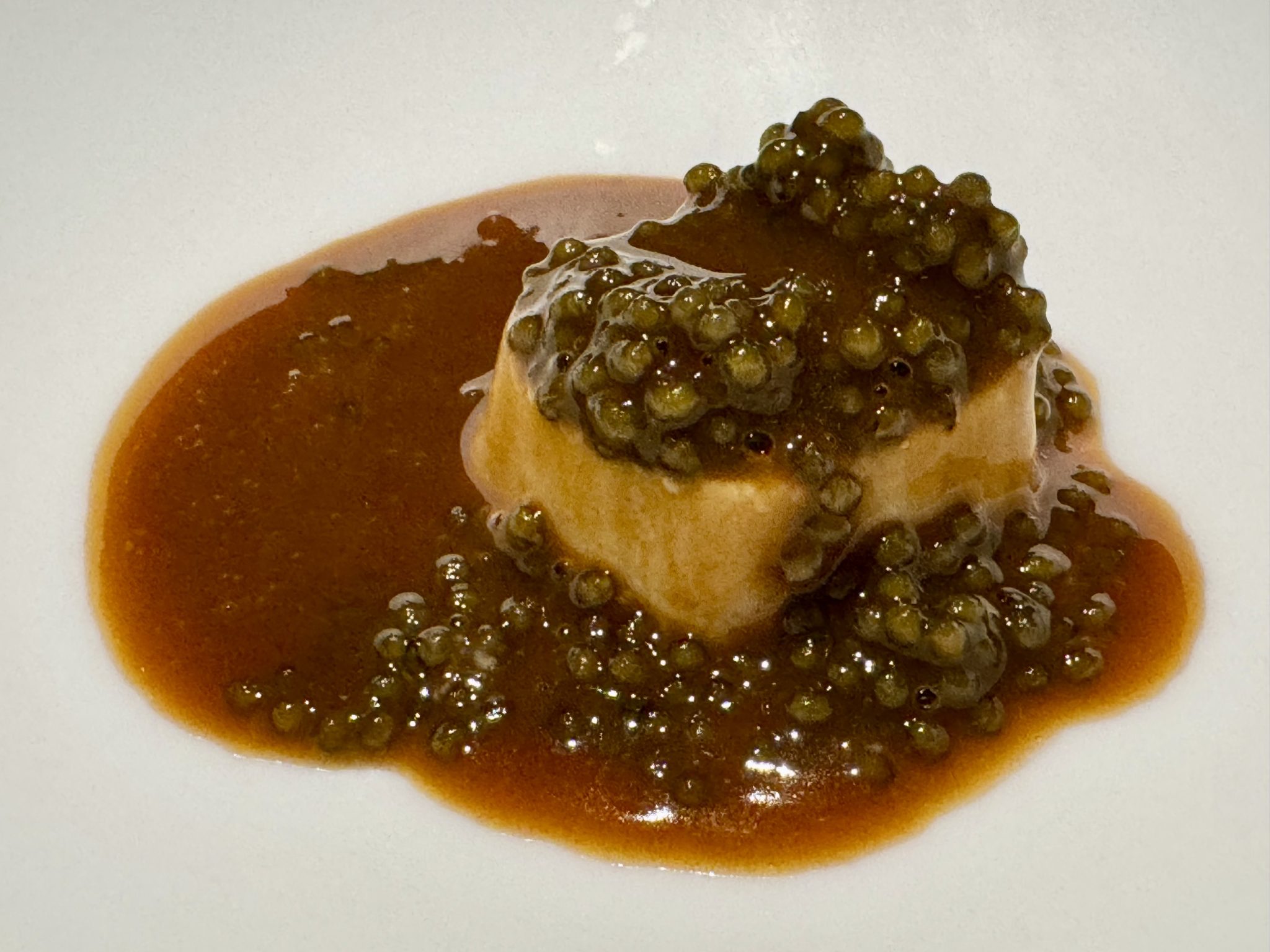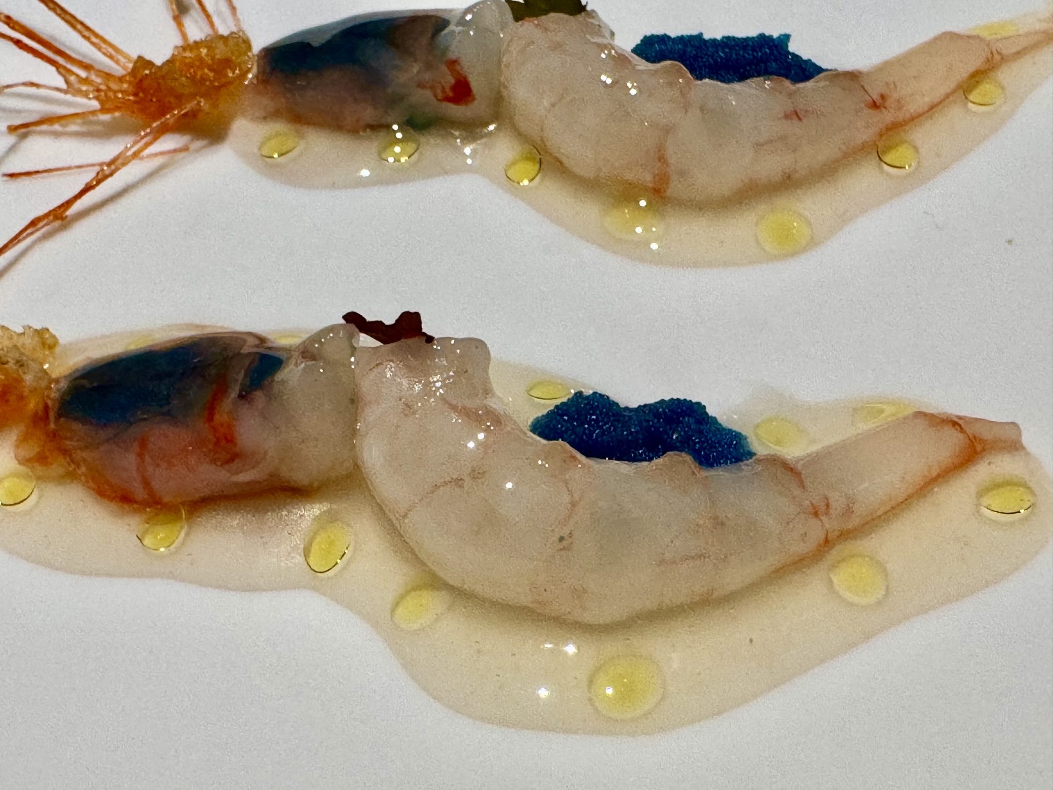 Comienzo centelleante que se atenuó con dos pases relajantes. A las delicadas quisquillas crudas de colas dulces, contorneadas por sombras de soja blanca siguió el fuagrás de pato curado en sal de anchoas en la propia sala. Salino y suavemente yodado, un clásico de Adrià.