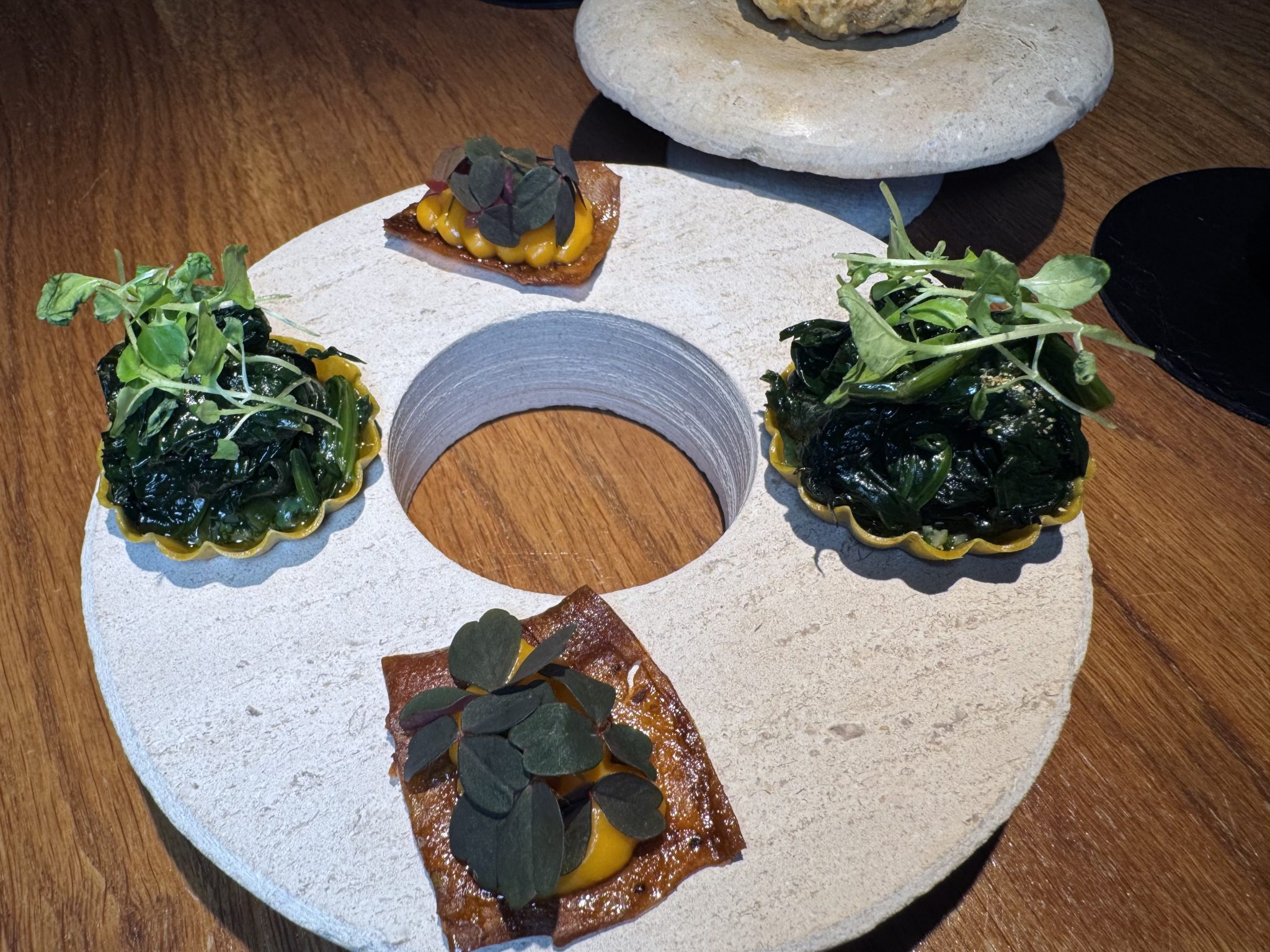 1.- Níscalos en tempura con praliné de piñones. 2.- Espinacas ahumadas. 3.- Pieles de boniato con crema de boniato y oxalis.
