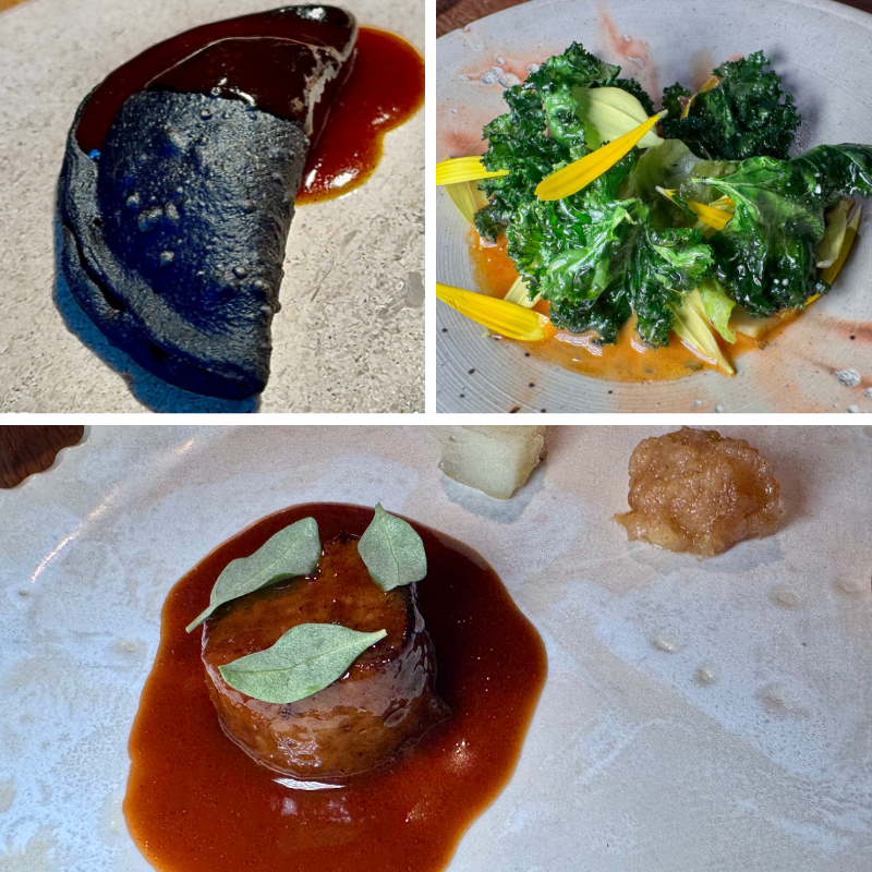1.- Empanadilla de jarrete de jabalí. 2.- Coles. 3.- Royal de ciervo con tubérculos y frutas.