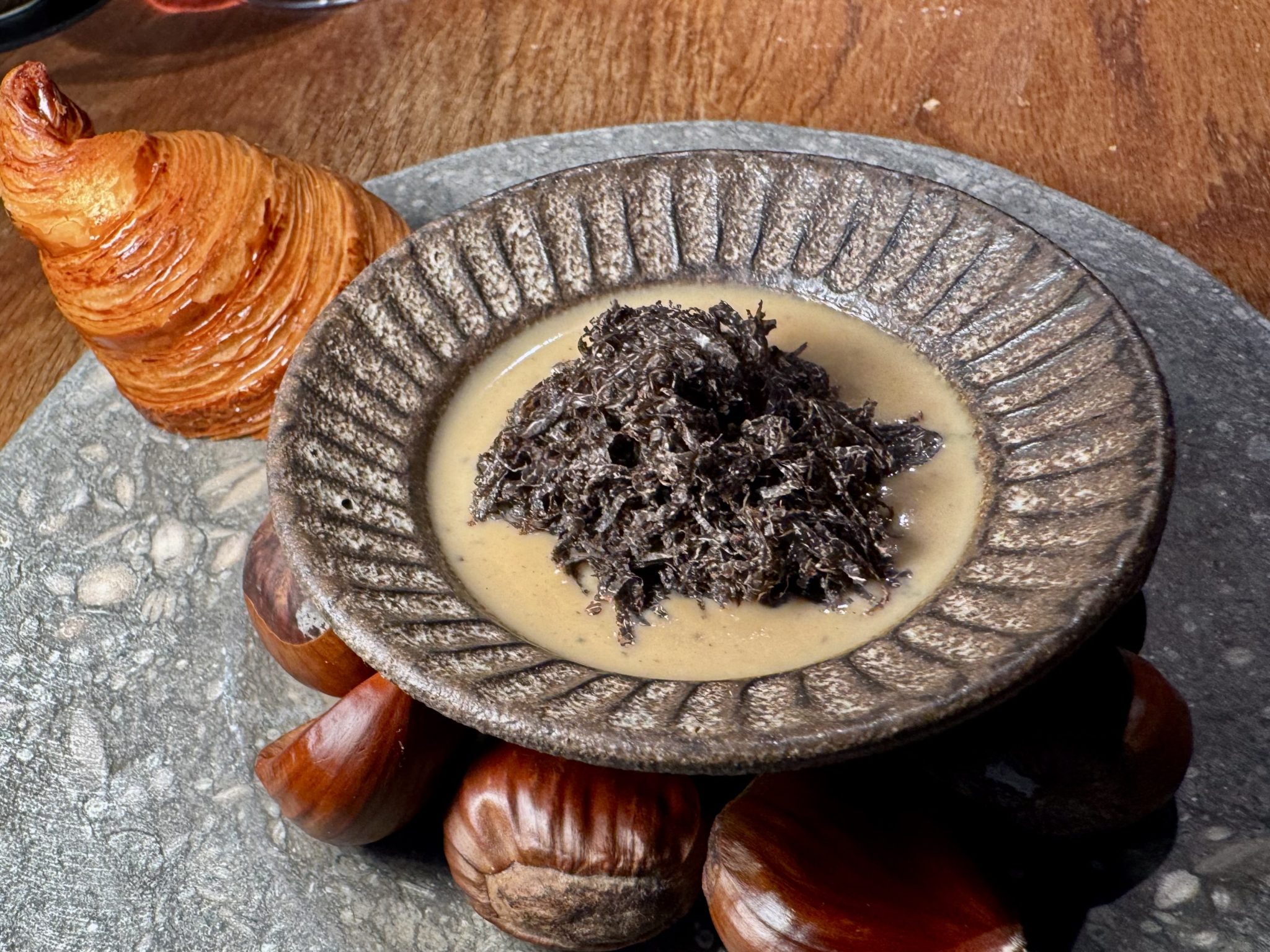 Plato tan invernal como la crema de castañas con armagnac y trufa negra, que se inspira en las fiestas gallegas que celebran la llegada de los primeros vinos del año. Otro pase sin reparos.