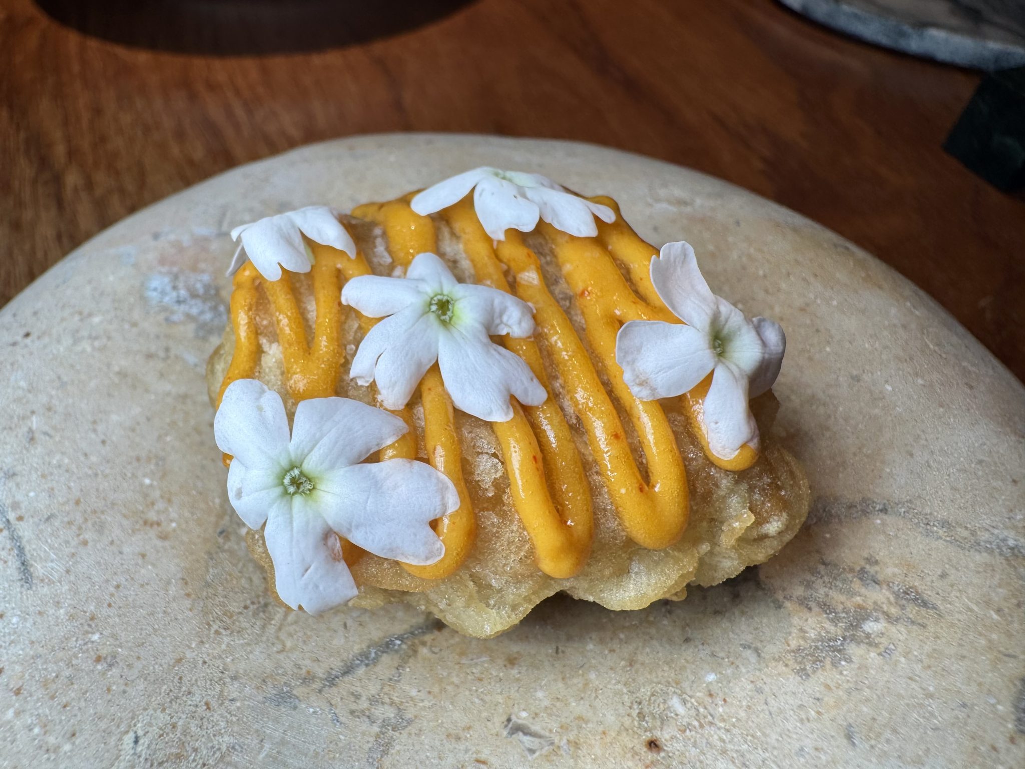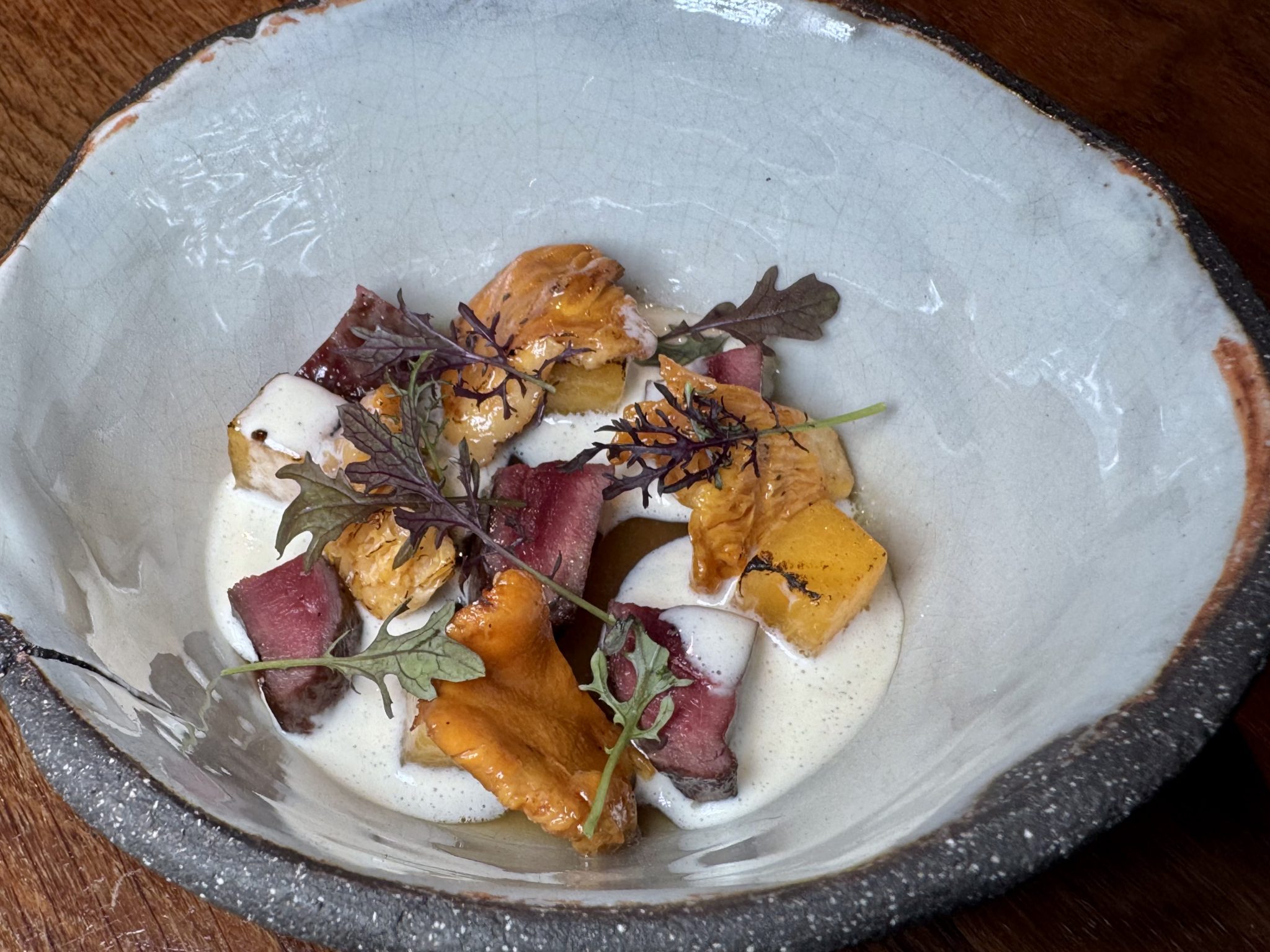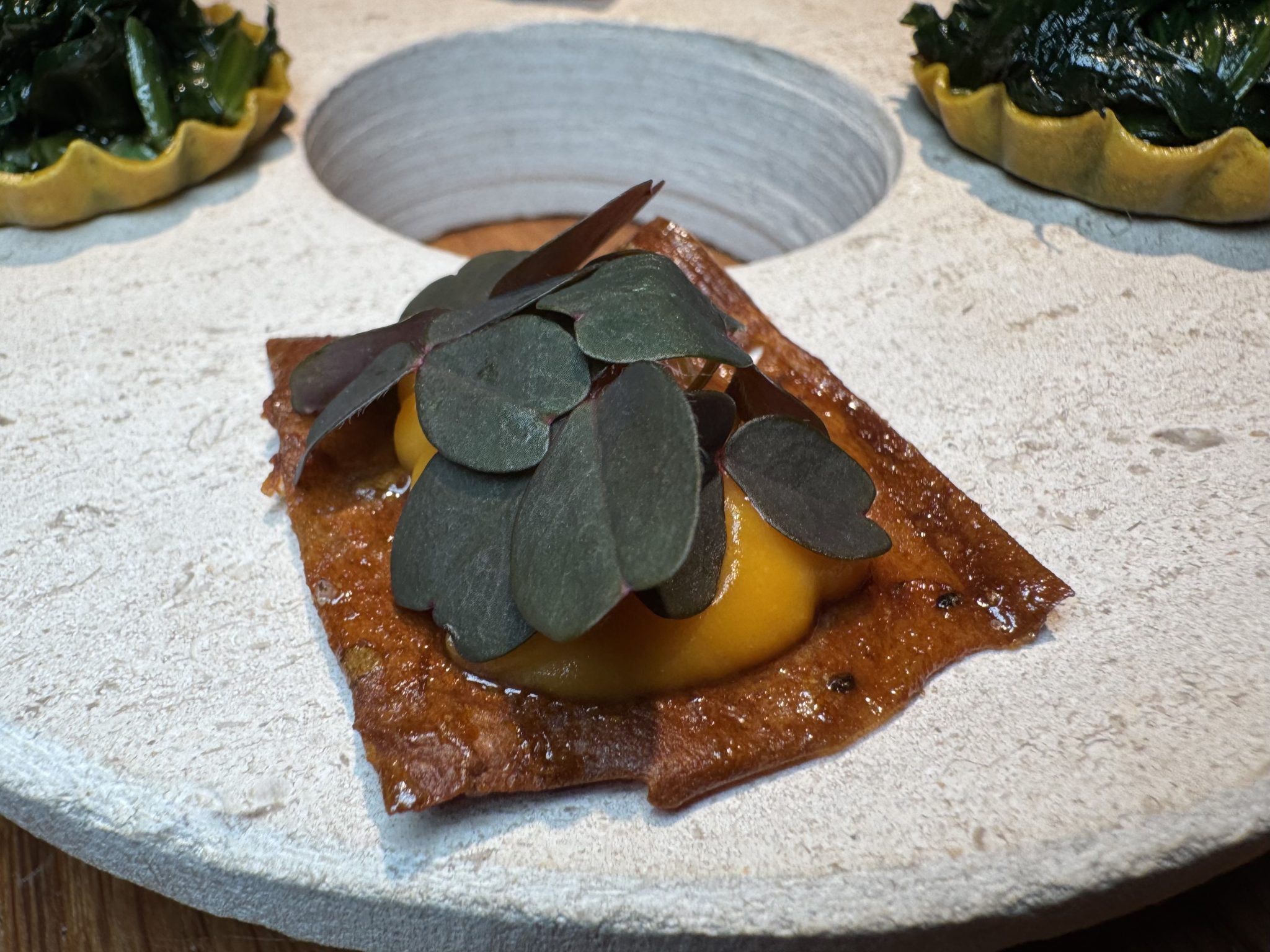 Los níscalos en tempura con praliné de piñones, la tartaleta de espinacas ahumadas y el canapé de boniato con umeboshi (ciruelas japonesas encurtidas), componen la trilogía de entrantes que anticipa las inquietudes de los platos que siguen.