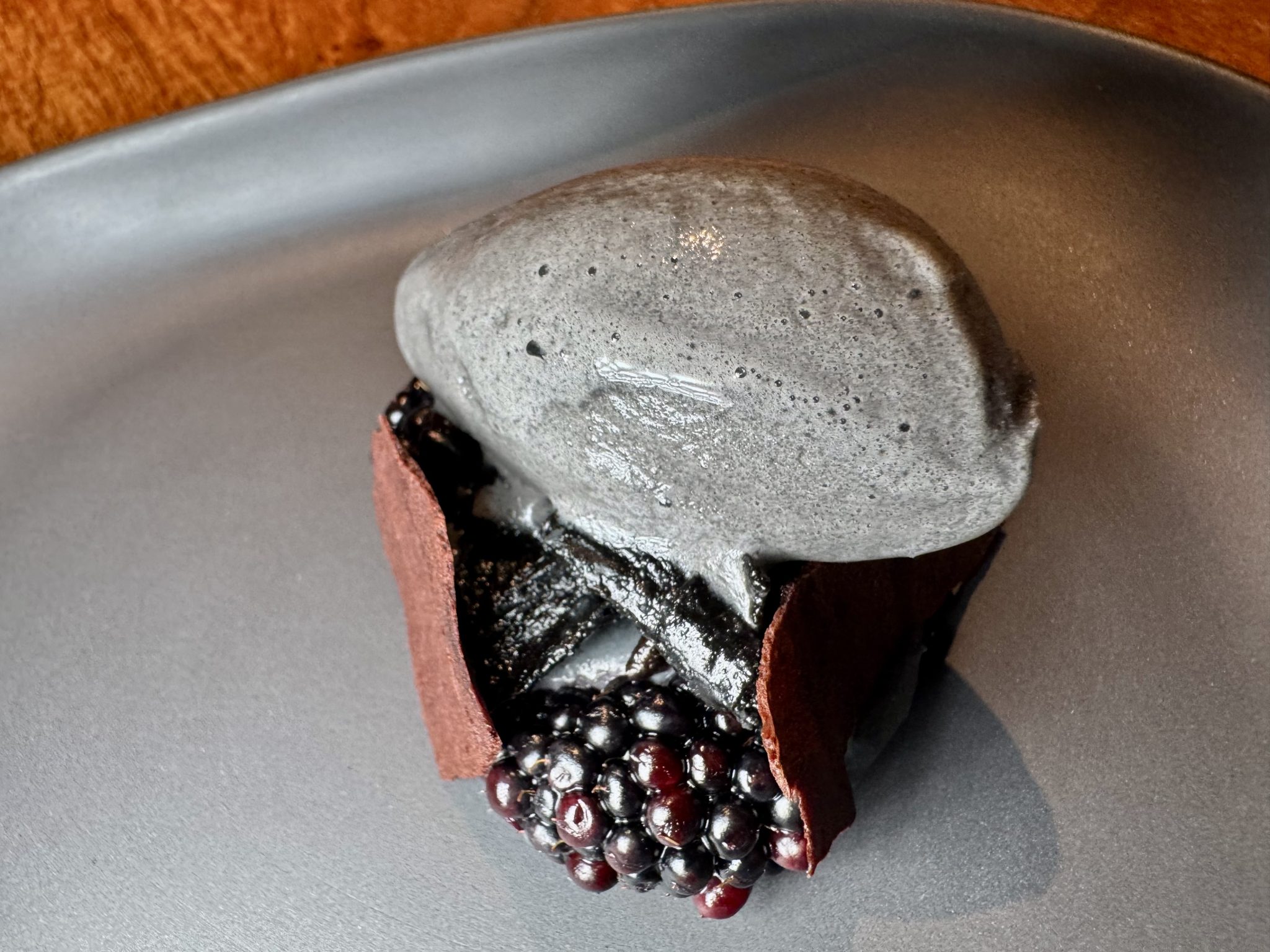Nada cambia con los postres, en una suave evolución de lo salado. Excelente la ganache de sésamo negro y moras encurtidas, conjunto húmedo y fresco, y bastante más goloso el sticky toffe pudding a partir de calabaza, caramelo, ajo negro y bayas de batax.