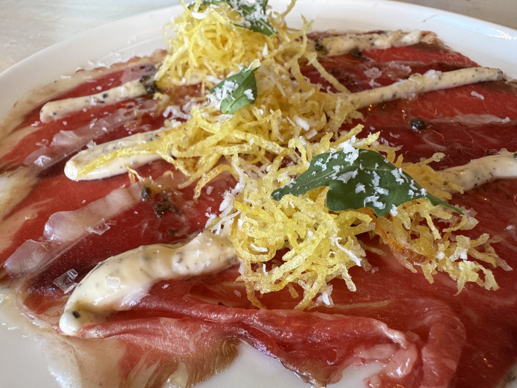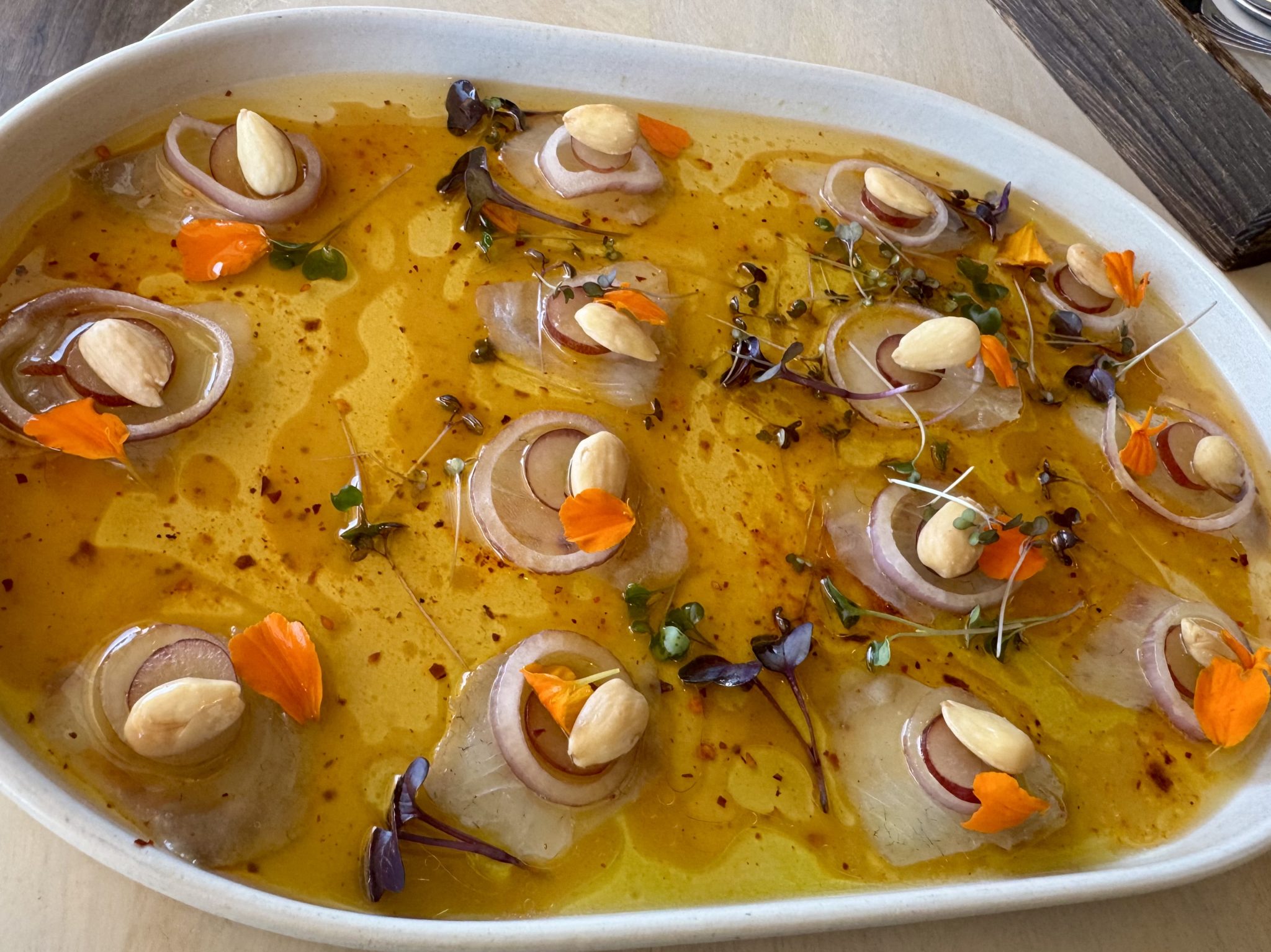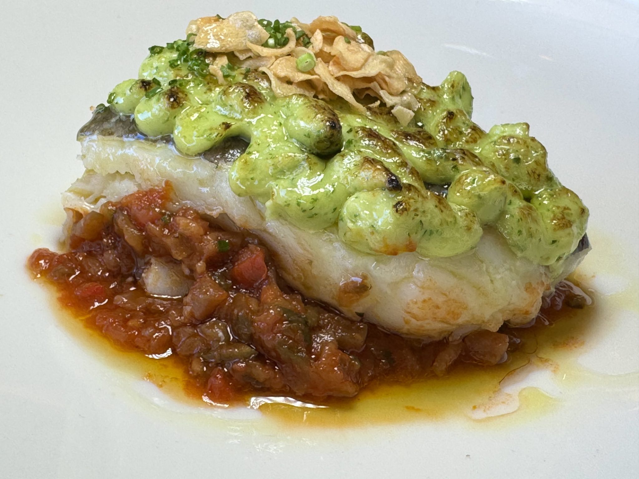El listado de principales prosigue con altos y bajos. Sabroso el bacalao al ajo tostado sobre pisto manchego, y algo anodinas las lascas crudas de dorada marinadas con almendras y uvas sobre un fondo sobrado de líquido y aceite.