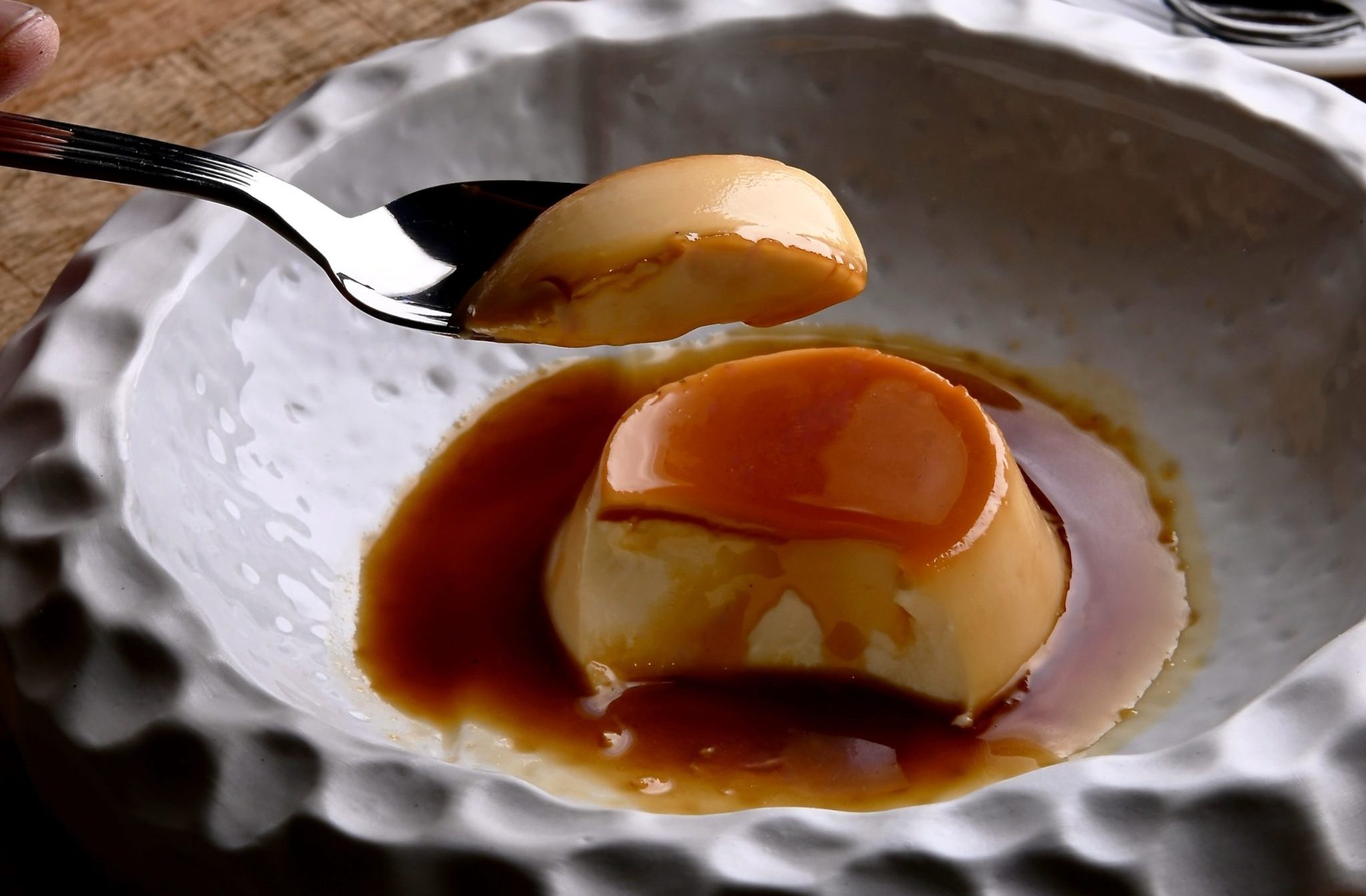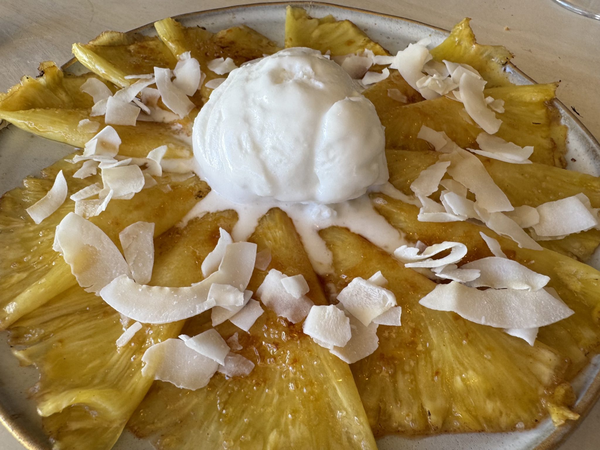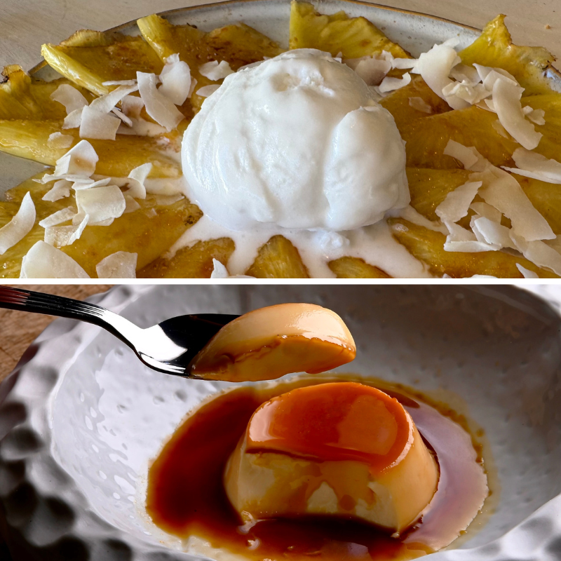 1. Carpaccio de piña con helado de coco. -2. Flan de nata de La Leña. Bramia Producciones