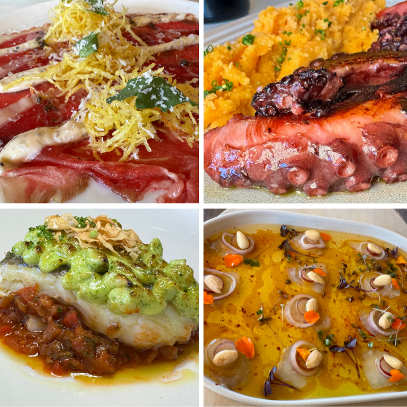 1.- Picaña con patatas paja. 2.- Pulpo con patatas revolconas. 3.- Bacalao con pisto. 4.-Dorada marinada.