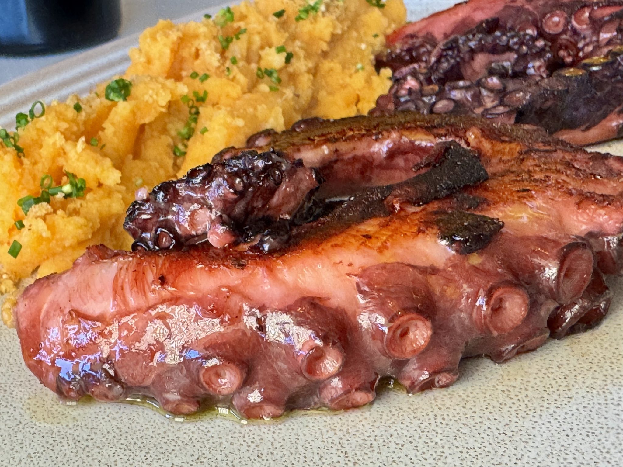 Recetas del inventario español, en este caso con algunos productos de apellidos ilustres: chistorra de Arbizu; pan del obrador Pan de Panes de Ávila; jamón ibérico de bellota de Beher; pulpo asturiano de El Viejo Pescador de Tapia de Casariegos; aceite virgen extra jienense Oro de Cánava y un vinagre cordobés Gran Reserva Flor de Genil superlativo.